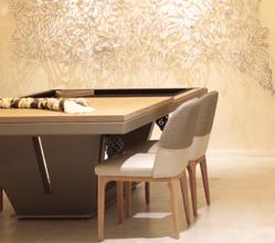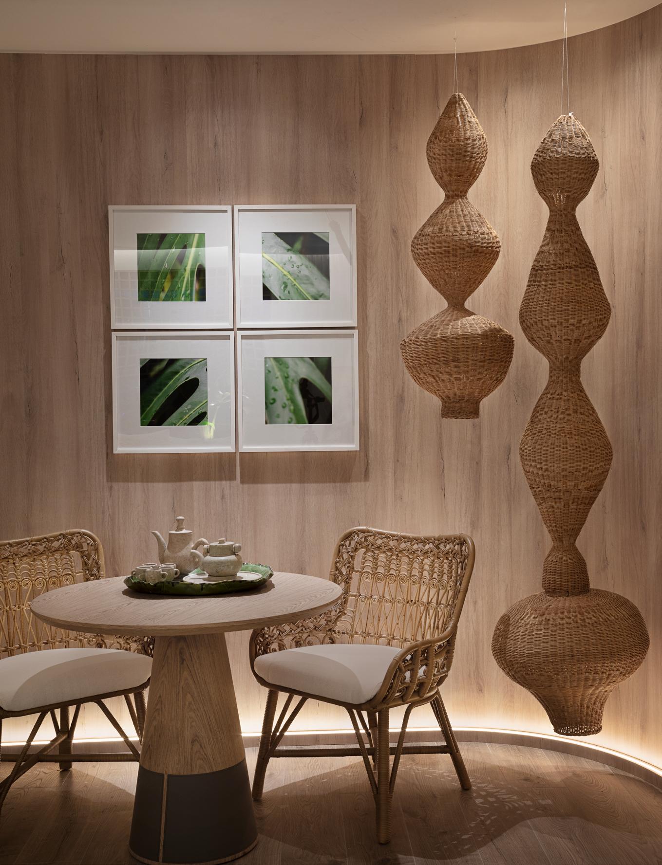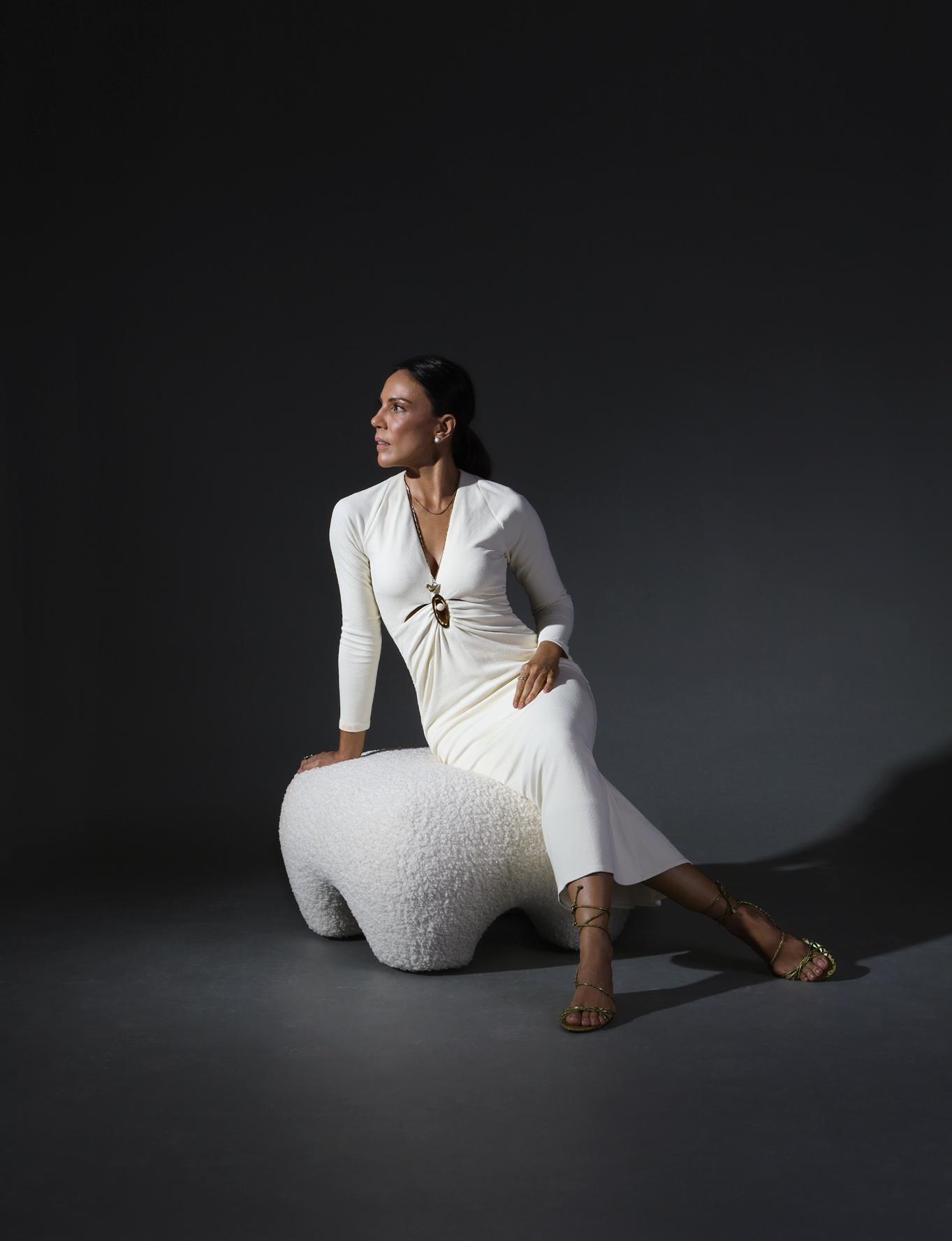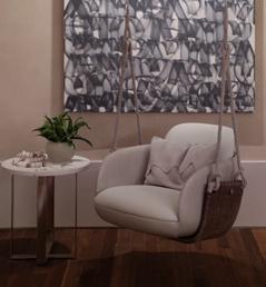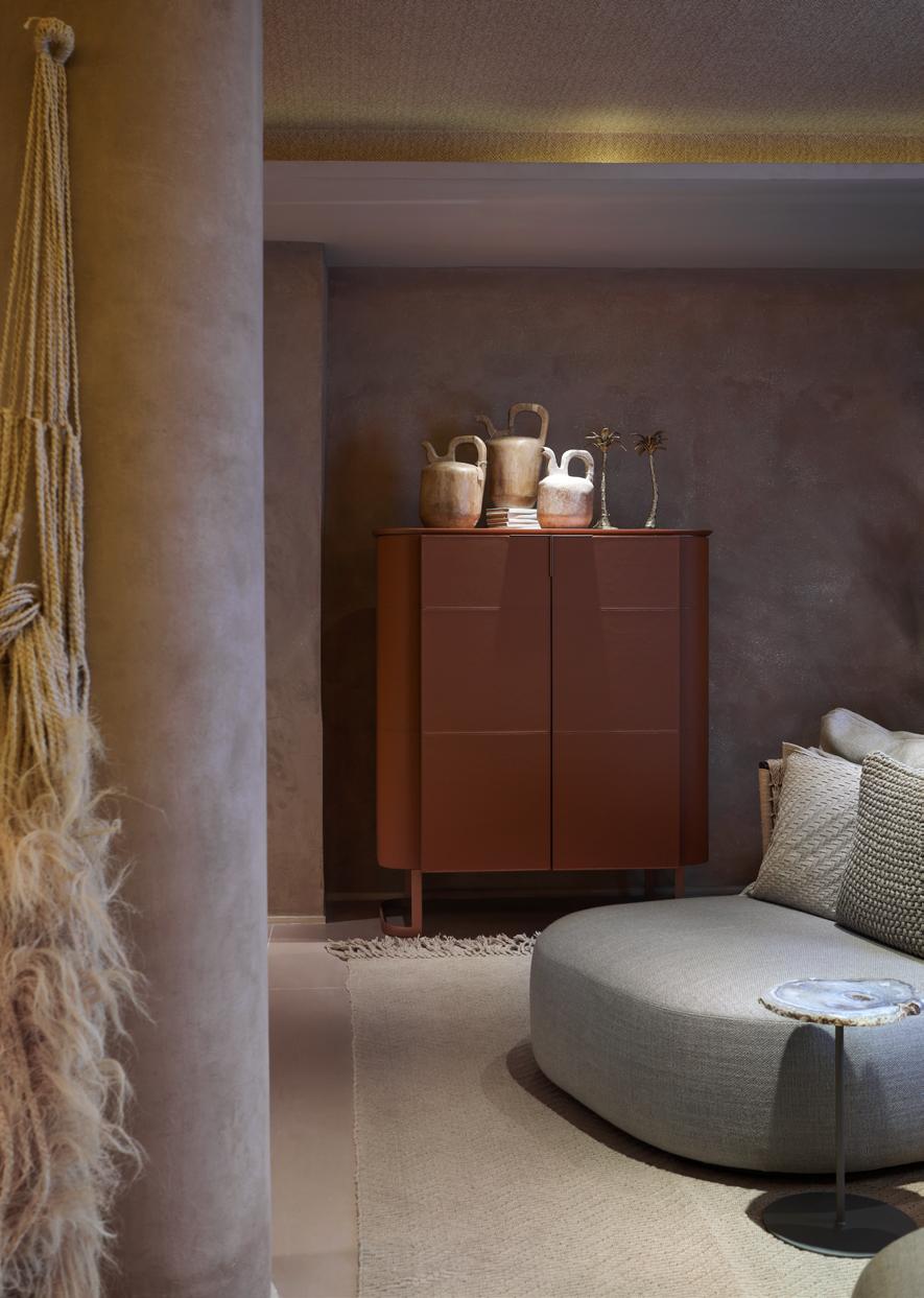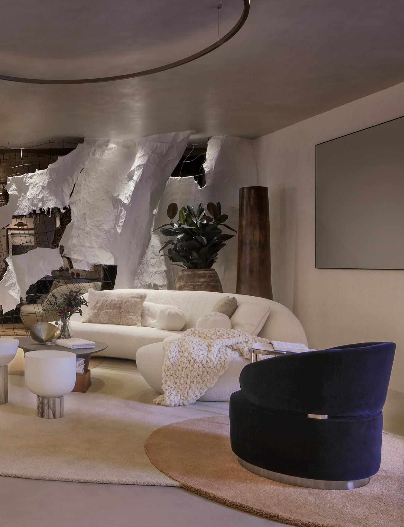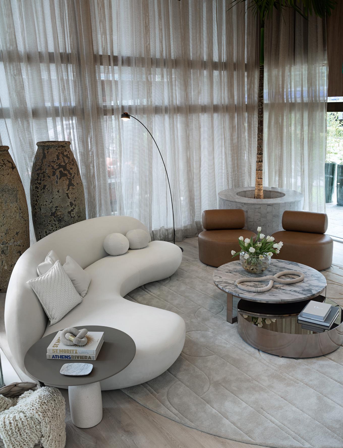 abraça a área do living, e, na área de jantar, a mesa de jantar Minos, em conjunto com as cadeiras Carrie e o aparador Greta. “Felicidade para mim está relacionada à confraternização e ao encontro, por isso investi em um mobiliário mais orgânico e suave. Mais próximo das formas do corpo humano”.