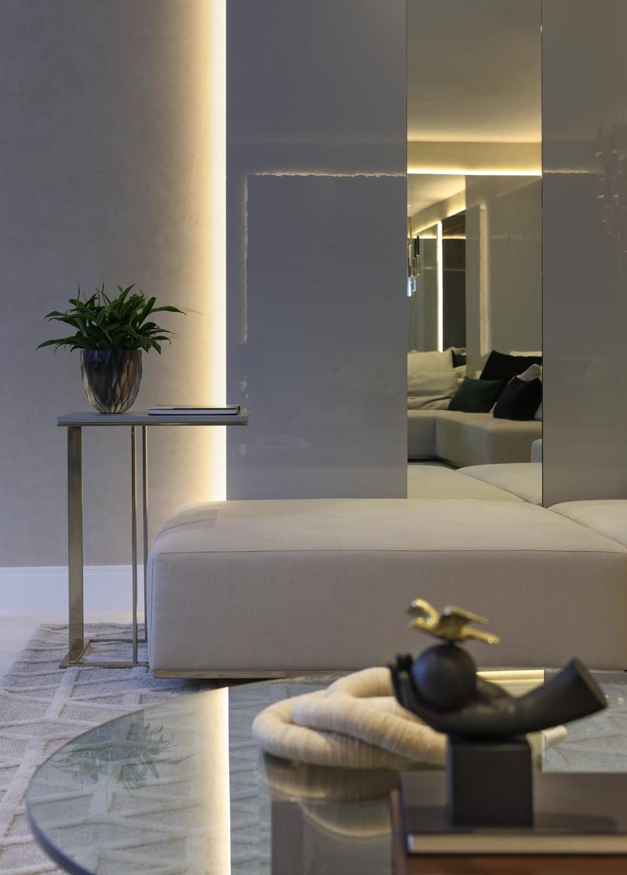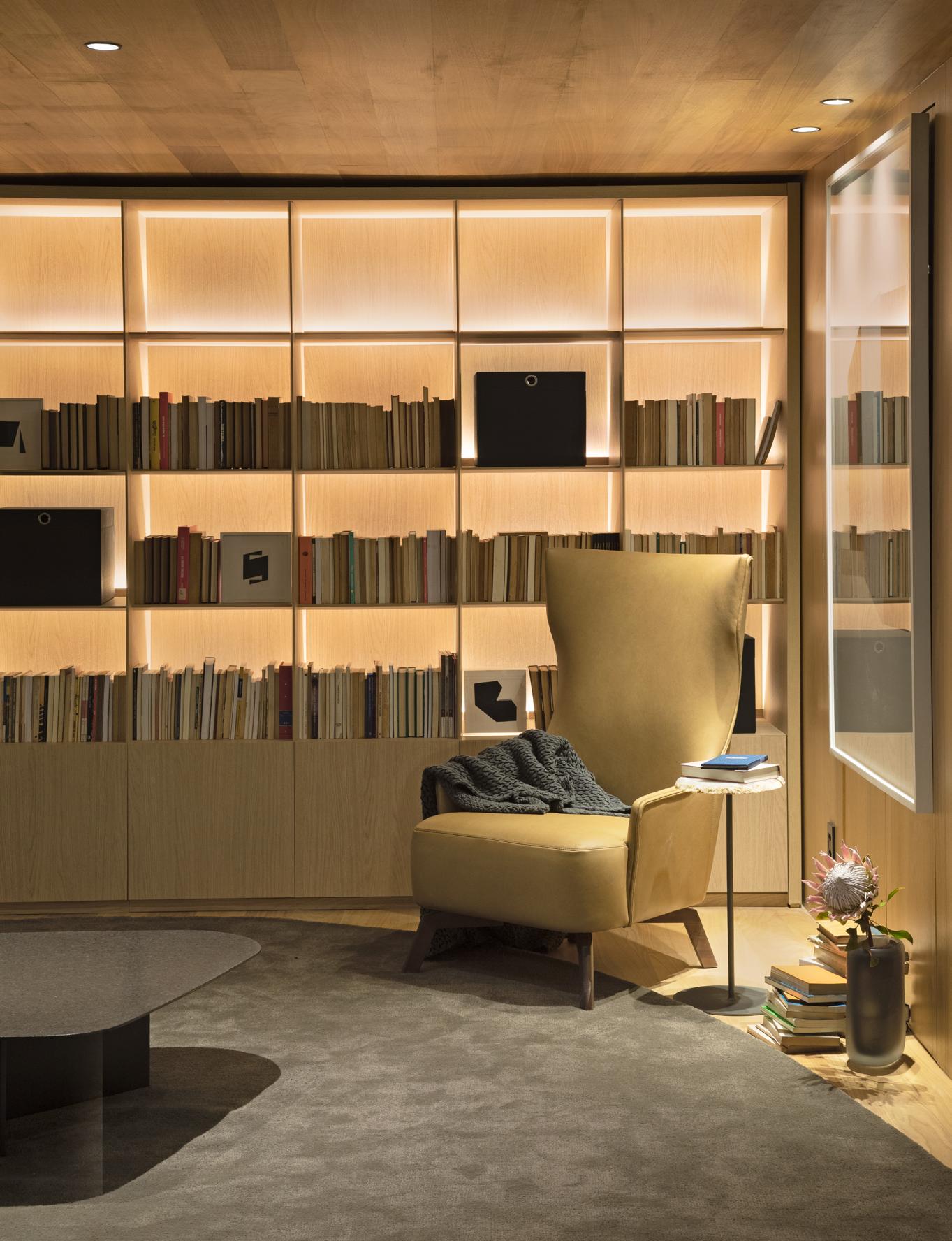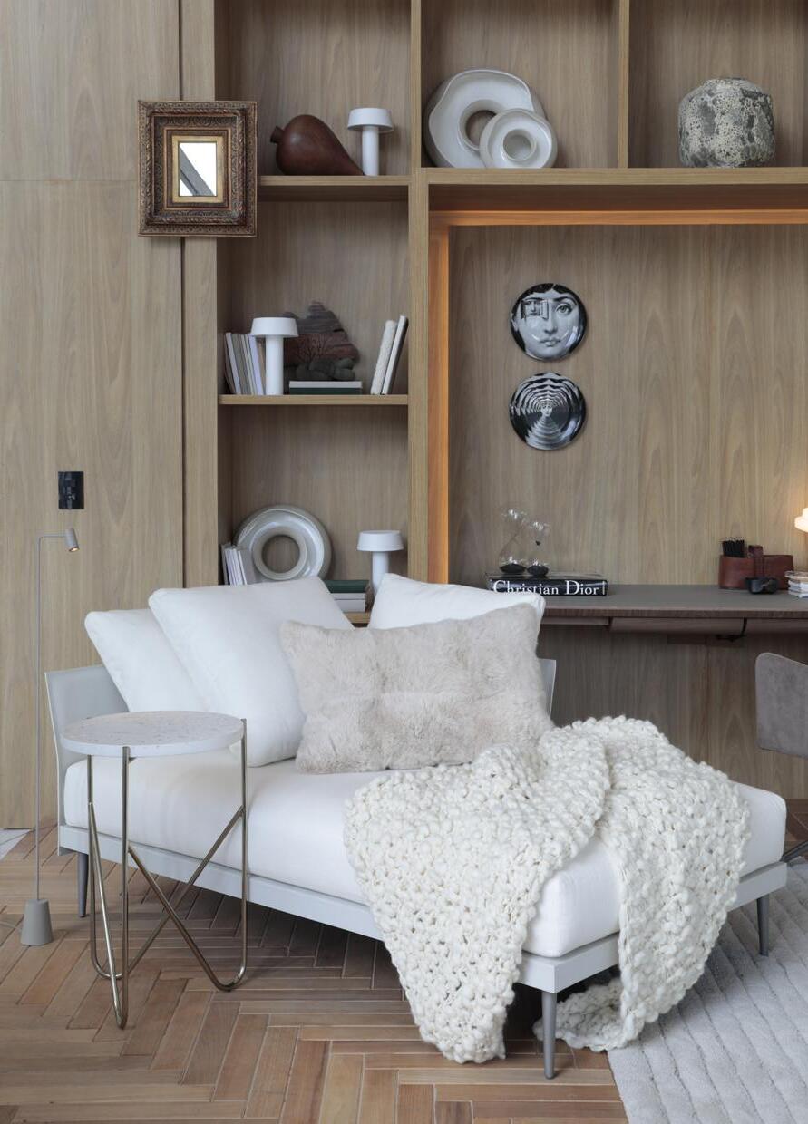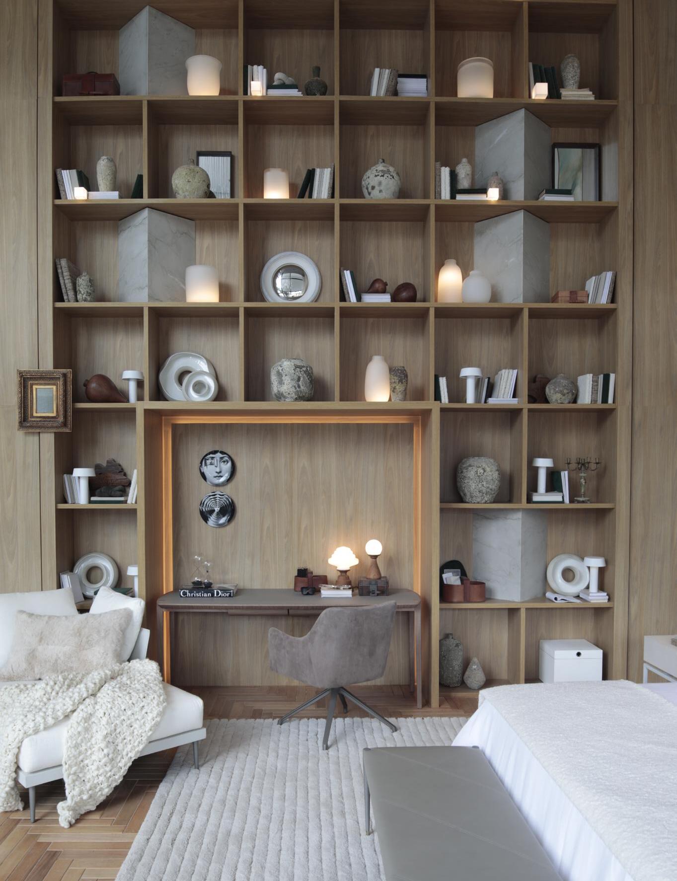 Para realçar ainda mais a preciosa coleção de objetos, uma iluminação indireta contorna as paredes arredondadas e também o interior dos nichos da estante. No mais, pontos de luz estratégicos, como agradam aos arquitetos, imprimem uma atmosfera intimista ao espaço.