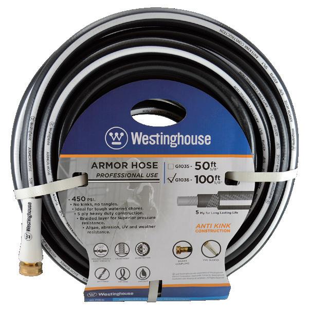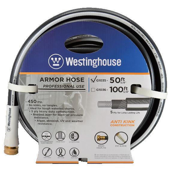 • 5/8" x 100 pies | 400 PSI • Manguera de 4 capas para trabajo pesado • Acople de bronce • Protector de acople de PVC • Capa tejida para prevenir que se tuerza y doble • Ligera y duradera • Resistencia a las algas, la abrasión, a los rayos UV y la intemperie Features • 5/8" x 50 ft | 450 PSI • Professional Use 5 Ply for Long Lasting Life • Brass Coupling • PVC Sleeve • Anti-Kink Construction • 5 ply heavy duty construction • Braided layer for superior pressure resistance • Algae, abrasion, UV and weather resistance G1035 ARMOR HOSE | MANGUERA PARA USO