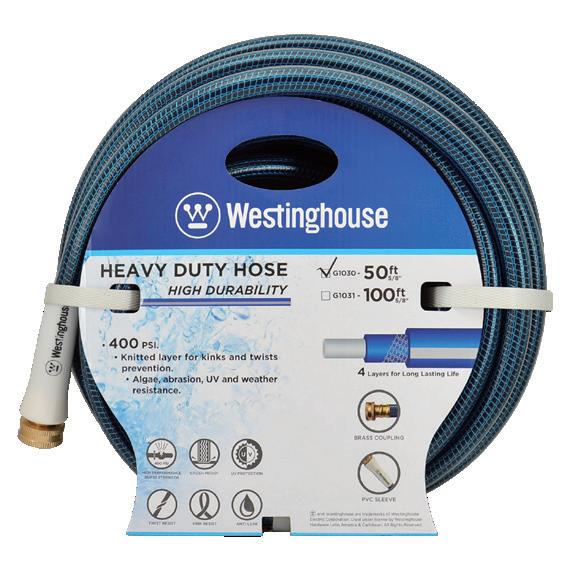 69 Features • 5/8" x 50 ft | 400 PSI • High Durability 4 Layers for Long Lasting Life • Brass Coupling • PVC Sleeve • Knitted layer for kinks and twists prevention • Lightweight and durable • Algae, abrasion, UV and weather resistance Características • 5/8" x 50 pies | 400 PSI • Manguera de 4 capas para trabajo pesado • Acople de bronce • Protector de acople de PVC • Capa tejida para prevenir que se tuerza y doble • Ligera y duradera • Resistencia a las algas, la abrasión, a los rayos UV y la intemperie G1030 HEAVY DUTY HOSE | MANGUERA PARA TRABAJO PESADO 5/8" x 50 ft Features • 360° automatic rotating sprinkler • Provide full coverage and allows use of multiple sprinklers • Coverage up to 2,500 sq ft • Easy to attach your hose to this sprinkler • Size: 27 x 21.5 x 9 cm • 3 Arm Whirling Sprinkler Applications • Large water coverage area for lawn • Garden maintenance • Adjustable rotary watering for backyard fun • Irrigation of crops