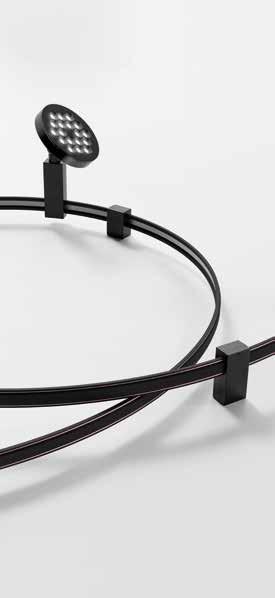 In a minimum section the two copper conductors, co-extruded with a section of thermoplastic elastomer, are left exposed to view yet fully safe. A slim band of harmonic steel runs along the back, forming the profile and allowing the different geometric shapes to be plied and retained. The track turns into a belt which can be bent at the construction site, simply, to accommodate any geometric shape dictated by the lighting requirements and by the architecture.