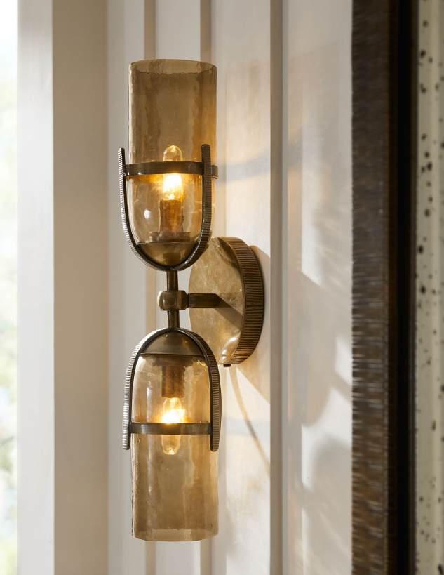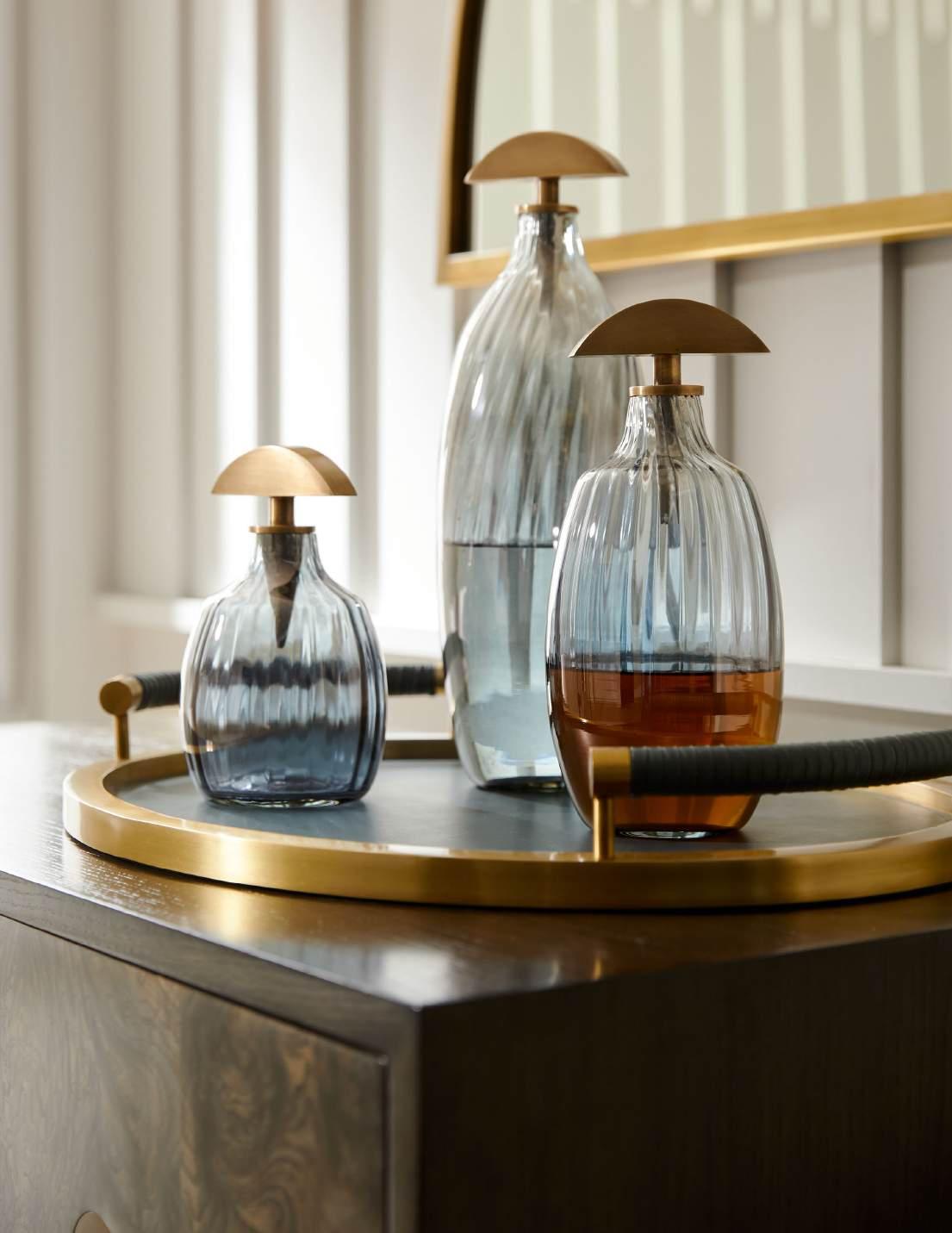 PG. 22, IMAGE 1: DWI25 IZARA SCONCE (TWO SHOWN), PTI24-SH024 JULIETTE LAMP, WMI84 JOCELYN MIRROR, AYI01 TALLULAH TRAY, ARI22 KARIS DECANTERS – SET OF 3