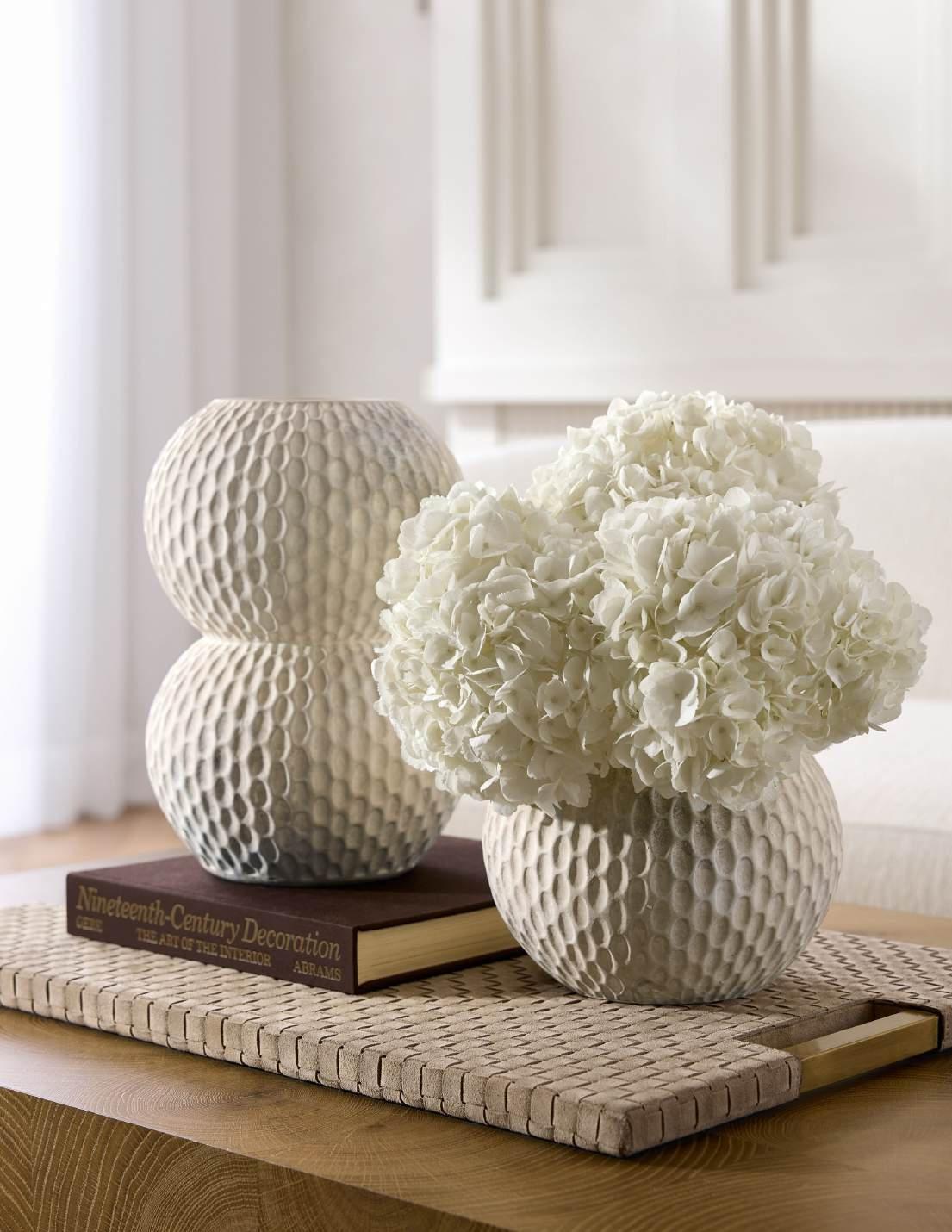 ACCESSORIES FURNITURE PG. 38 IMAGE: 8171 POPPY CHAIR CLOUD BOUCLÉ (THREE SHOWN), FDS23 KINSLEY DINING TABLE, DFS03 KASAI SEMI-FLUSH, AVS13 KAYLI VASES – SET OF 2