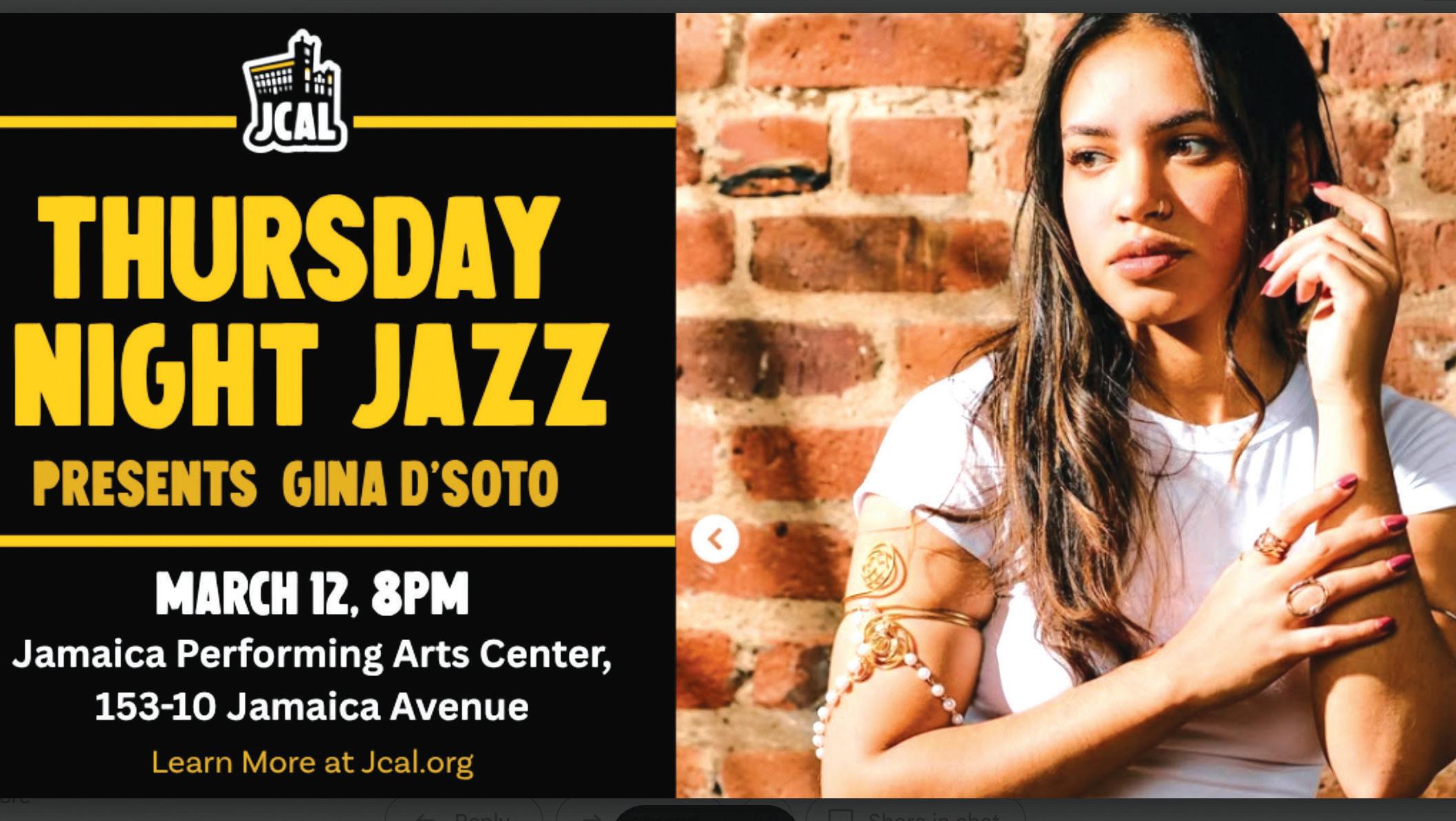 Esta edición de Thursday Night Jazz contará con una presentación especial previa al espectáculo por parte de miembros de Jazz Tide , una banda de exalumnos de Queens College. Jazz Tide abrirá la noche con una presentación a las 7 PM., seguida por el concierto principal encabezado por Gina D’Soto a las 8 PM.
