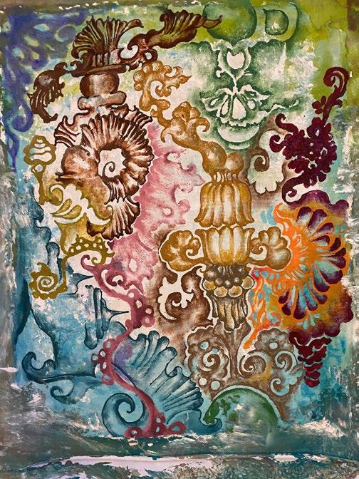 I like to experiment with different techniques. In addition to painting with acrylics and mixed media, I have made recycled art from felt, pieces of fabric and paper, among other things. I work with different emotional states and see the world as if through different color filters. Green, blue and purple are very strong in my art.