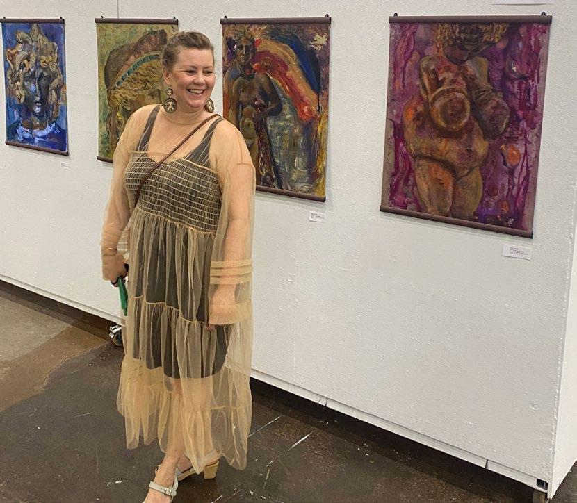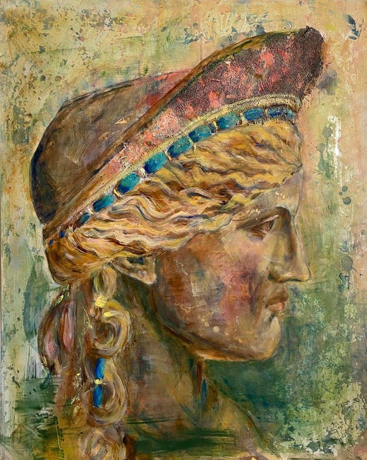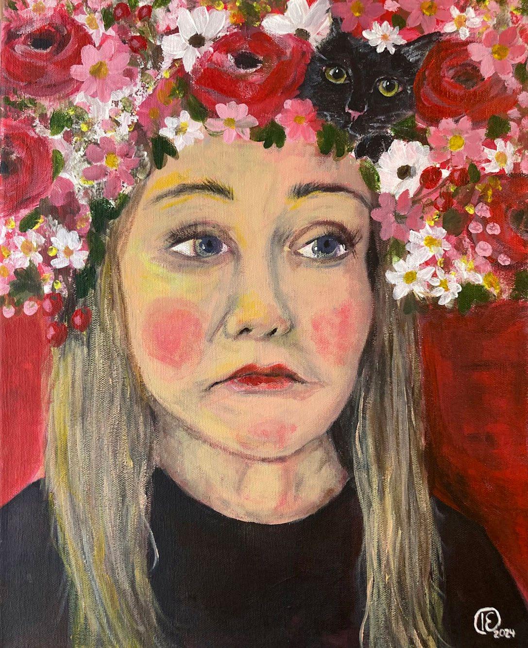Valmistuin kuvataiteilijaksi kesällä 2025 Helsingissä. Nuorempana en olisi voinut kuvitellakaan tekeväni kuvataidetta työkseni. Elämä on kuitenkin tehnyt tehtävänsä, ja saatoin yllätyksekseni nelisen vuotta sitten löytää sisälläni uinuneen luovuuden. Sen avulla tuon esiin syvimpiä ajatuksiani, tunteitani ja kokemuksiani ympäröivästä maailmasta. Se maailma on hurja. Se maailma on kaunis. Kerron maalausteni avulla tarinaa siitä, millaista naisena oleminen on. Tutkin historiasta käsin, mitä naiseudessa on tavattu pitää pyhänä ja tavoiteltavana. Ihanteiden rinnalla maalaan myös naisen todellista elämää: sen kauneutta – toisinaan myös kauheutta. Pyrin taiteessani löytämään yhdistäviä tekijöitä, jotta erilaisuuden sijaan kiinnittäisimme huomiota samankaltaisuuksiimme eri taustoista huolimatta. Runsaita ja värikkäitä teoksiani sävyttävät melankolia ja kaukokaipuu, mutta myös luottamus kaikkeen hyvään maailmassa ja lopulta ihmisen tarkoitusperissä. Työskentelen sekatekniikalla alumiinille yhdistäen akryylivärejä maalauksen pohjaelementiksi, toisinaan hiiltä luonnosteluun ja lopuksi öljyvärimaalausta.