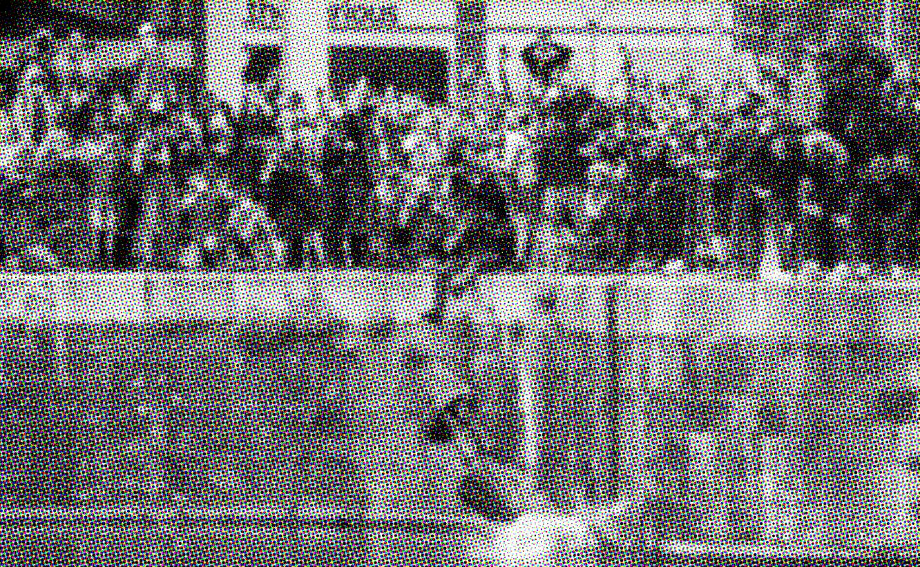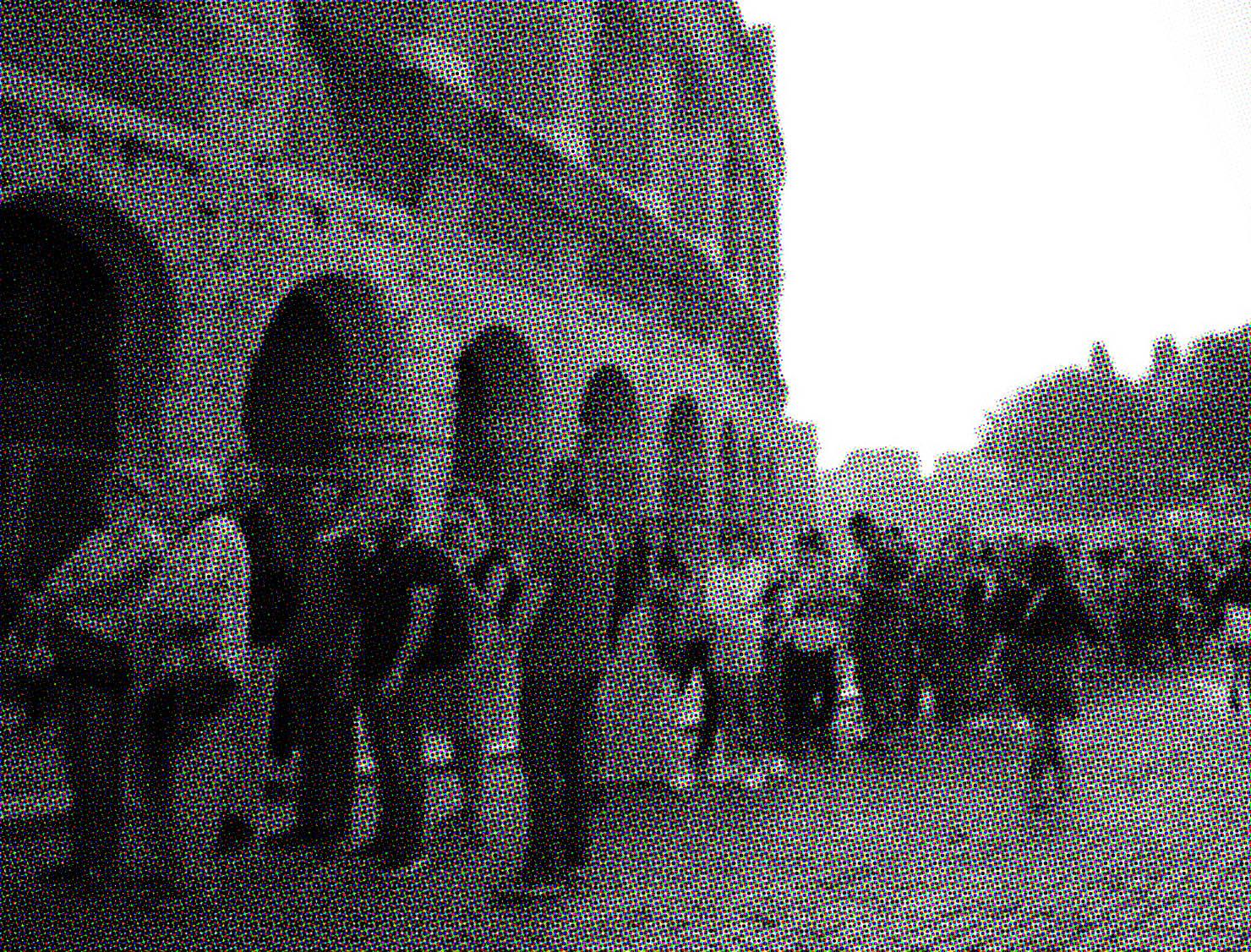 zit, komt de capsule langzaam in beweging. Even verblindend door een reflecterend licht dat binnenkomt, stijgen ze boven de bodem van het moederbord uit. Ongeveer op de hoogte van de boomtoppen begint de elektromotor te blazen en worden ze met hoge snelheid omhoog geschoten. In een fractie van een seconde weet Human niet wat hij ziet. Een menigte op een groot plein(29) lacht en praat met elkaar, wijst naar vormen en
