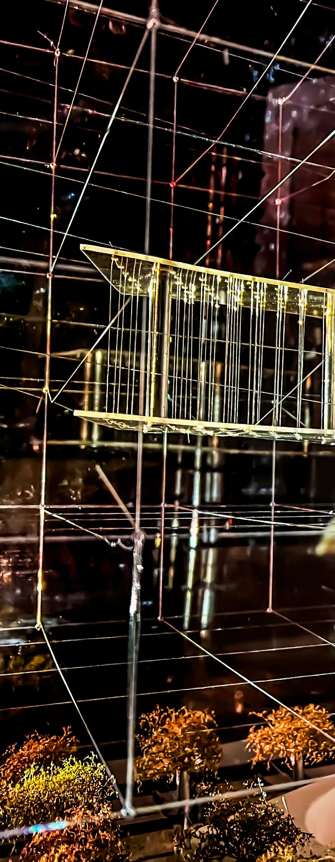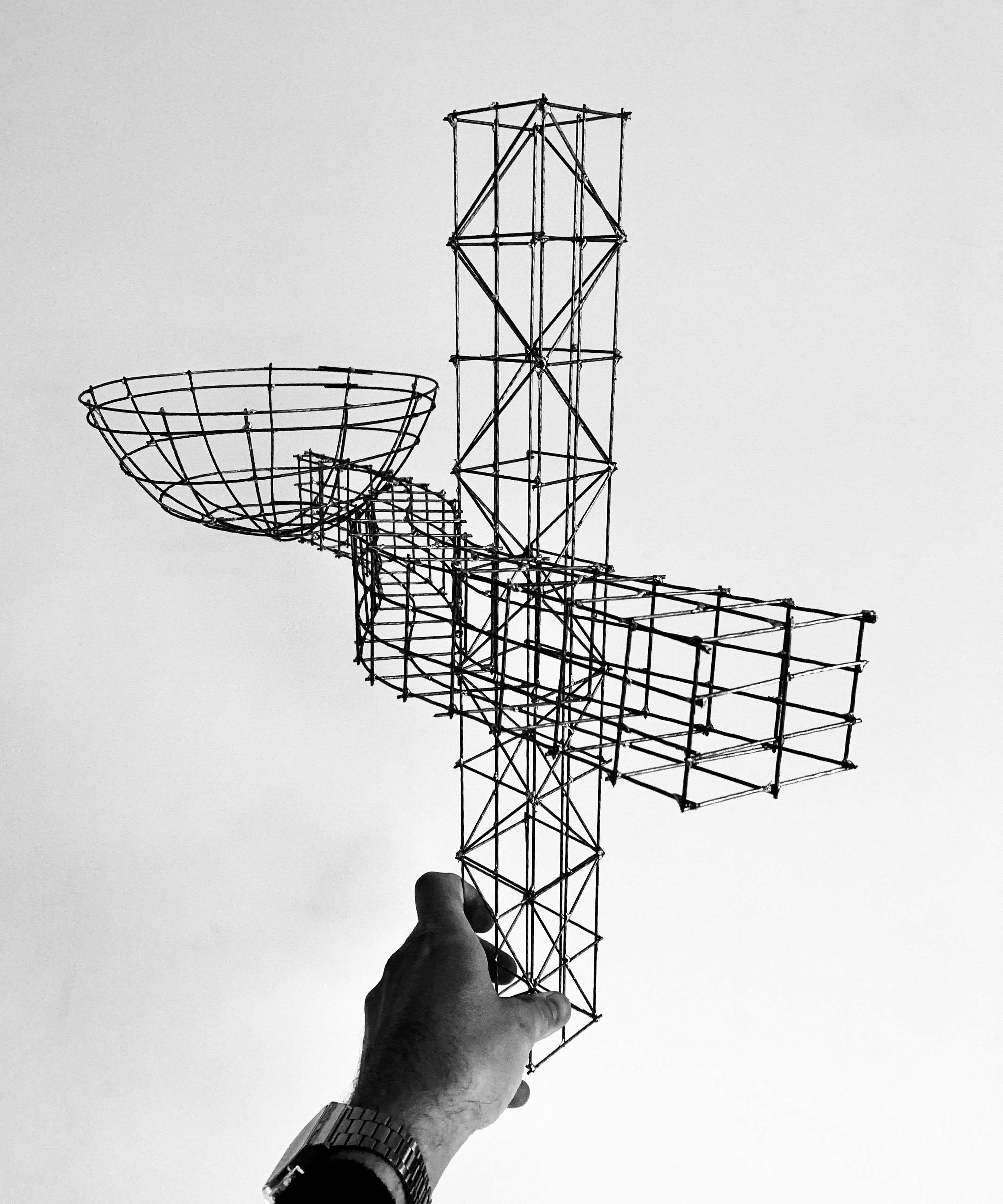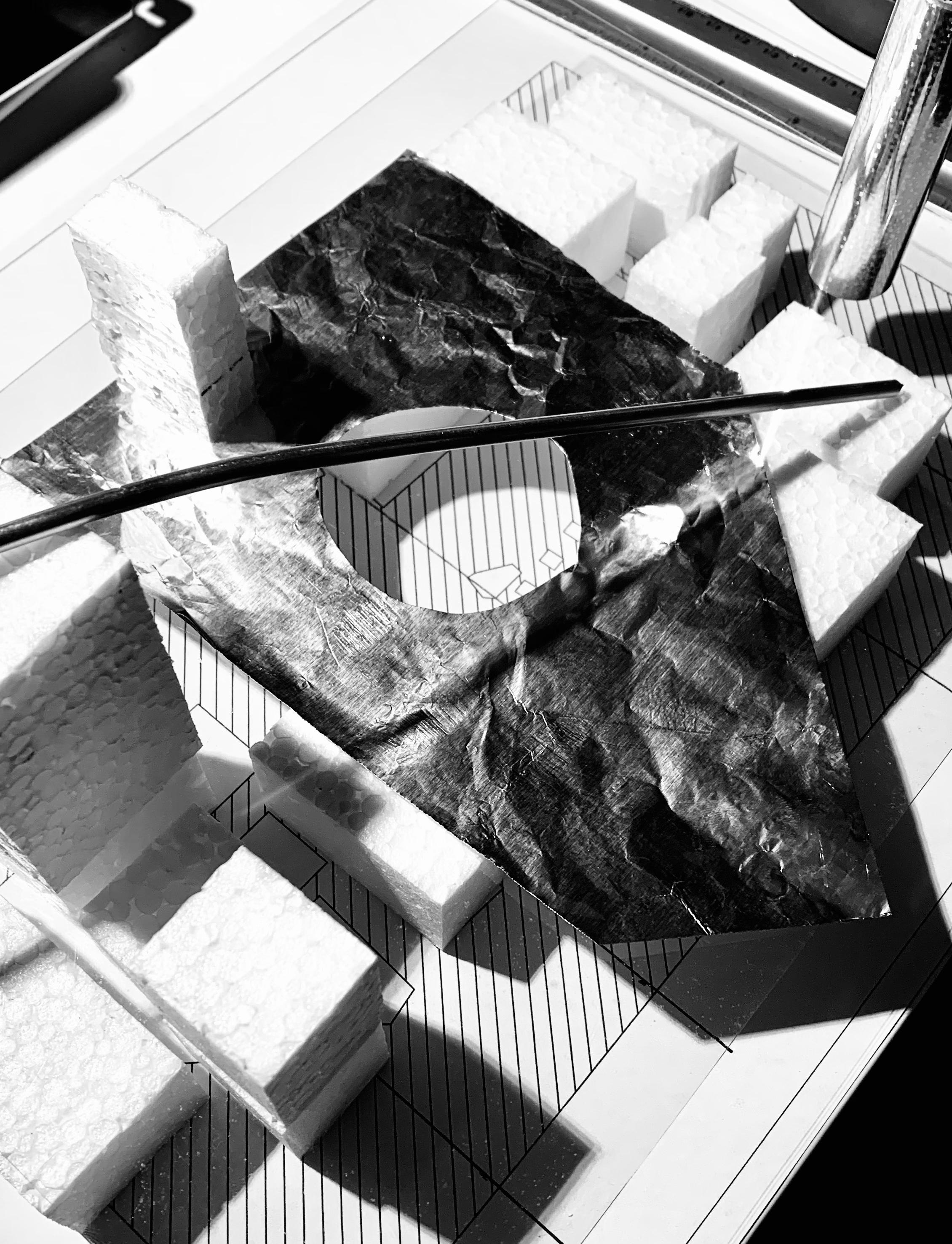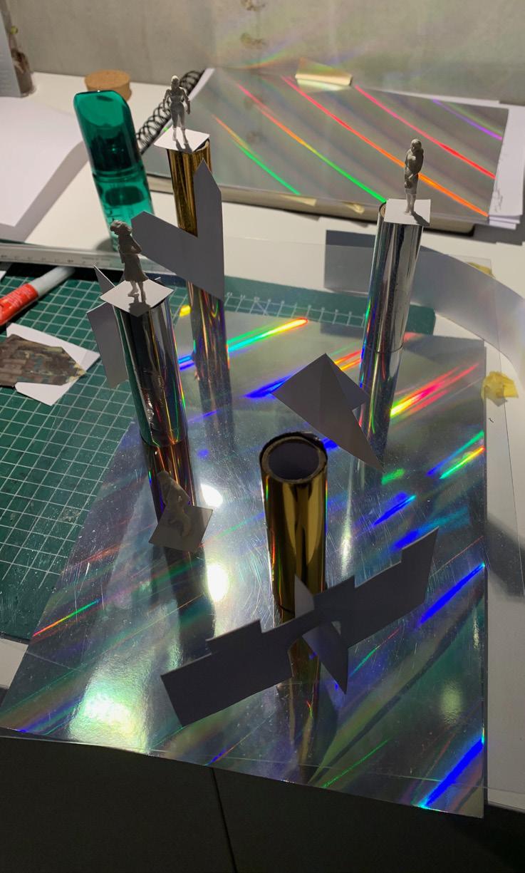 In de eerste weken ben ik begonnen met het maken van een maquette, op advies van Ralph Brodruck, omdat dit nog weleens zou kunnen helpen bij het onderzoek. Ik ben begonnen met het verzamelen van materialen en telkens wanneer ik even tijd had, werkte ik het ruimtelijk verder uit. En verbazingwekkend ontstond er een model waar ongemerkt het hele onderzoek in verwerkt was. Deze maquette heeft mij van begin tot eind geholpen, een soort heilig beeld waar ik naar kon staren en dat mij op alle momenten heeft geholpen om koers te houden.