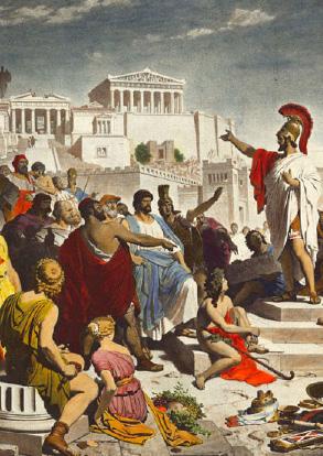 Human leeft helemaal op en praat met Dees over wat ze zien. “Wat zou dat zijn?”, vraagt Dees aan Human. Met dat ze het beter willen bekijken, begint de driehoek tegen hen te spreken over vrijheid, gelijkheid en grondrechten(31). Hier had Human nog nooit van gehoord. Vrijheid kent hij niet en al helemaal geen eigen wil. De marmeren driehoek die zich heeft voorgesteld als Trias vertelt over de oude democratie, een macht die