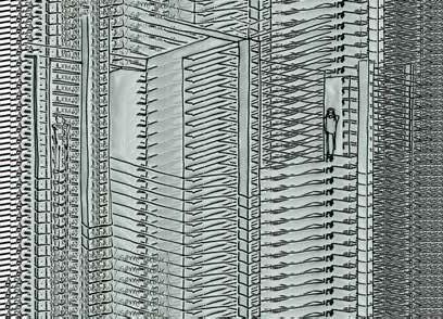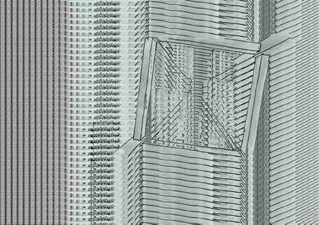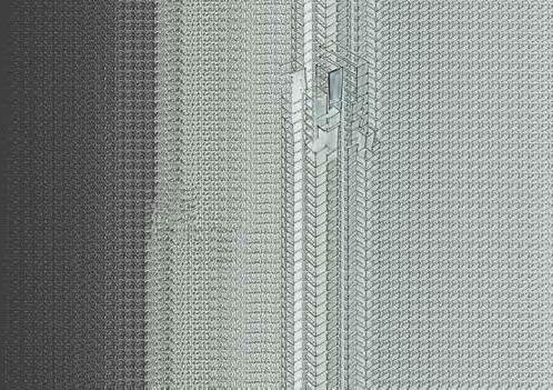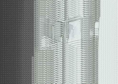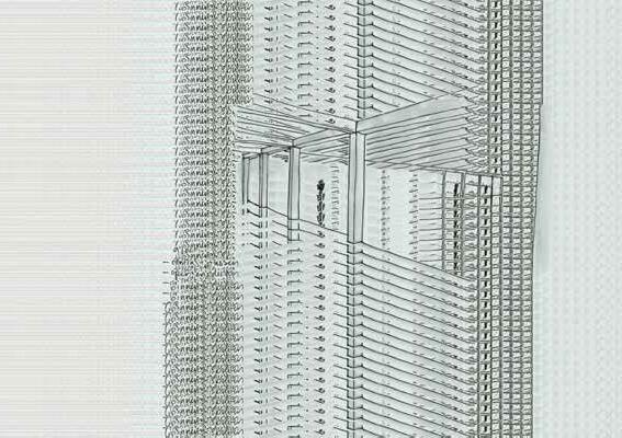 Ter plaatse van de gevels van de wo ningen, zitten er openingen in het net. Op een zeker moment schiet de ‘walk way’ dwars door de toren heen. Waar door je als bezoeker door de private leefwereld van de bewoner loopt.