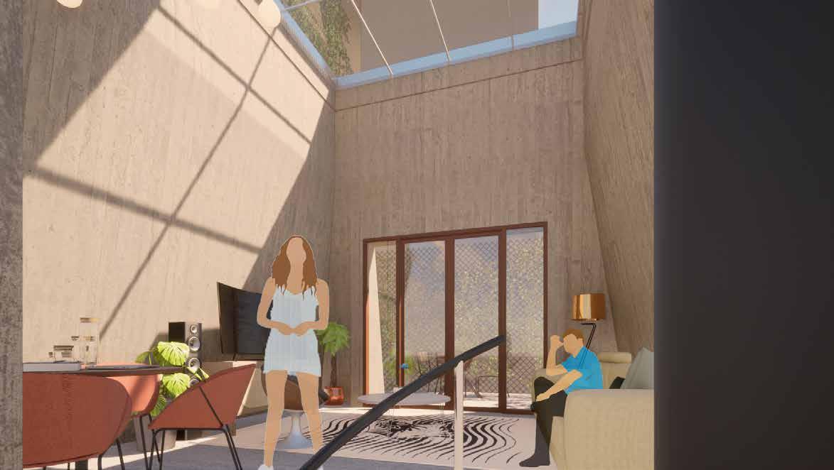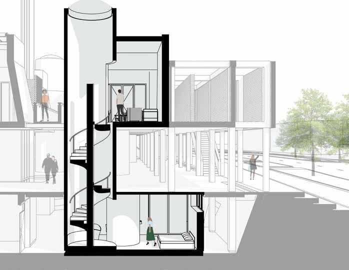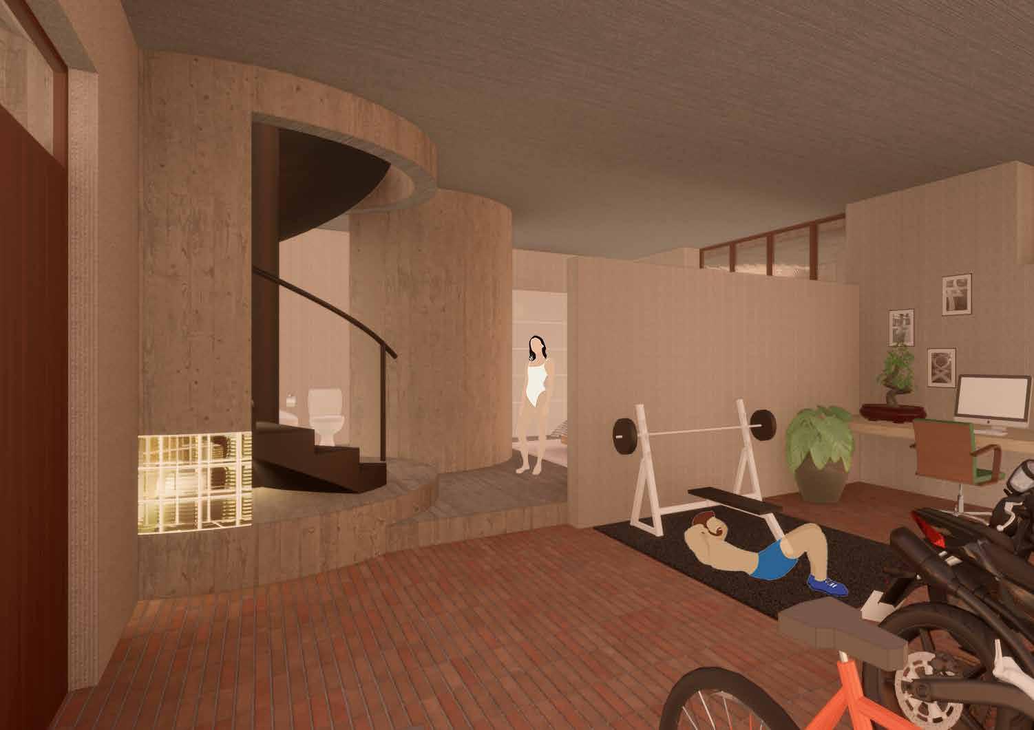 Als bewoner komt je aan met de auto op de parkeerplaats. Via de parkeer plaats vervolg je de weg via de tunnel die onder de weg doorloopt. Je komt aan in het souterrain van het gebouw. Hier zijn de ingangen van de woningen te vinden. Deze hebben een flexibele ruimte die in is gericht als slaapkamer/ werkruimte. Via de wenteltrap ga je naar de 1e verdieping, de begane grond sla je daarbij dus over. Deze wenteltrap is een soort cilinder welke een halfrond daglicht heeft, dit zorgt ervoor dat het daglicht door de cilinder het souterrain in wordt geleid. Op de eer-ste verdie ping is vindt je de woonkamer, keuken en een kleine buitenruimte.