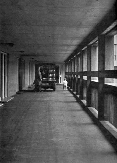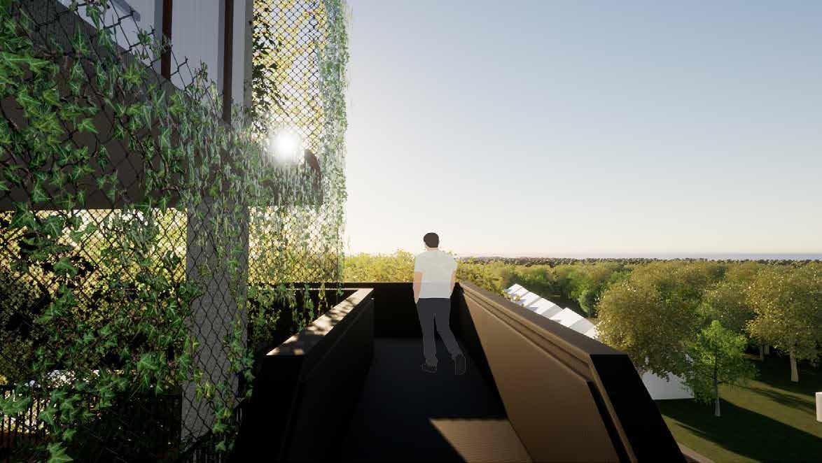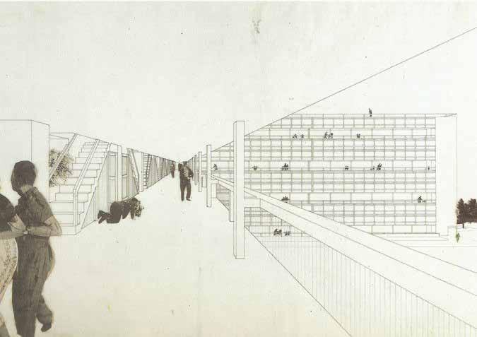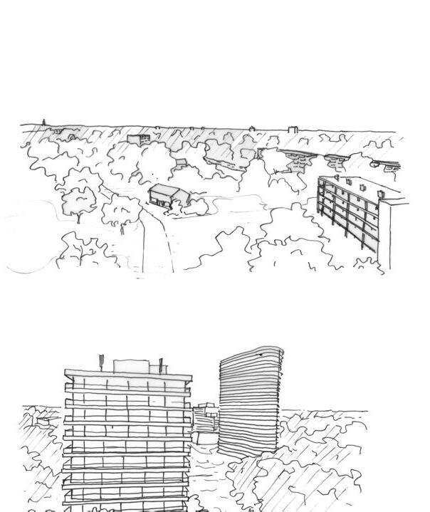 dwongen om vlak langs de buitenruim tes van de woningen te lopen hetgeen zorgt voor wrijving omdat je de kans loopt oog in oog te staan met de bewo ners. Ook tijdens de route die langs de toren omhoog gaat (de walkway) zullen dit soort momenten plaats vinden. Dit zijn ook direct de momenten waarop je je afvraagt wie hier de aap is en aan