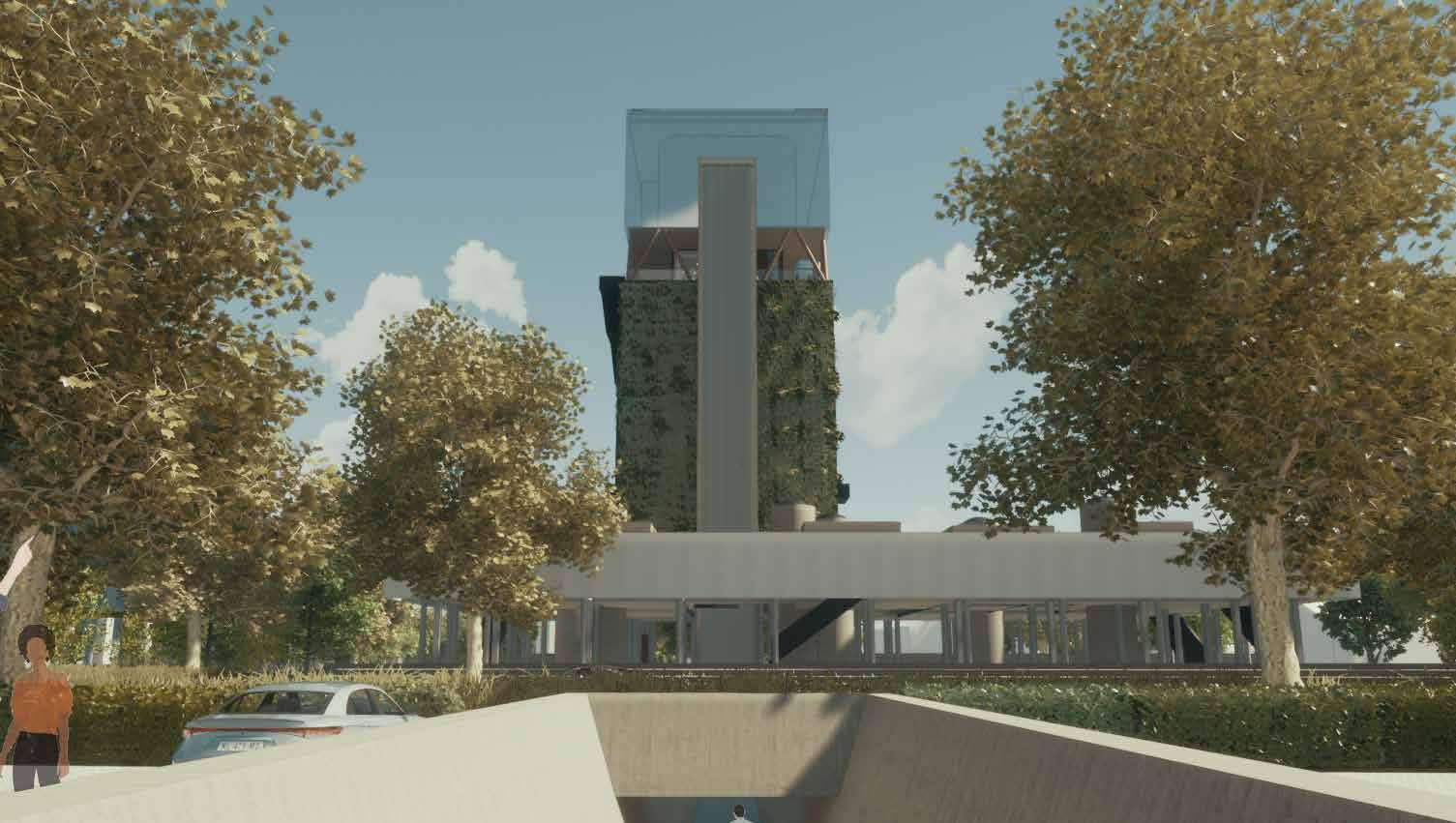 De nieuwe gevel die om de toren heen komt is een stalen net waar planten aan kunnen groeien. Dit uit zich in een ‘natuurlijke vitrage’, waardoor er in de toren onder de bewoners een andere beleving plaats vindt. Daardoor is het ook mogelijk om niet constant in con tact te staan met de bezoeker.