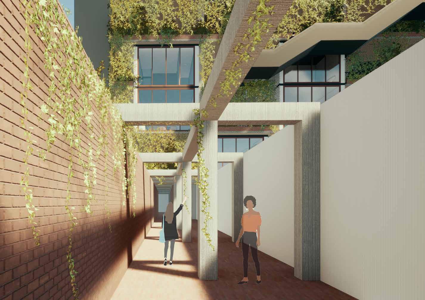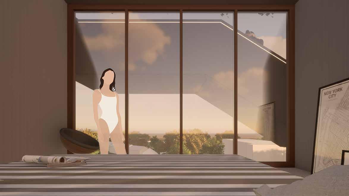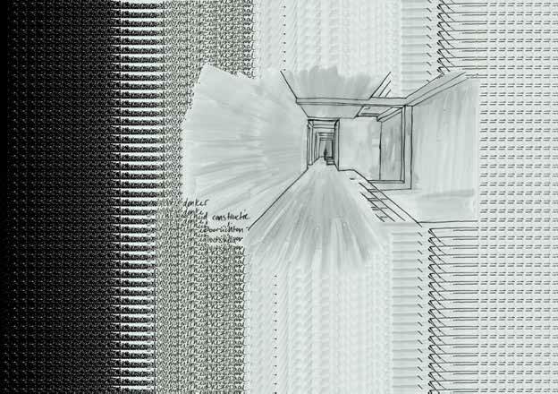 Om er voor te zorgen dat er wrijving ontstaat tussen de bezoeker en bewo ner maak ik verschillende architect onische ingrepen die dit versterken. Ook het contrast tussen de theatrale sinistere ingrepen en het aangenaam wonen, zorgt voor een groot spannings veld. Binnen het gebouw ontstaat bijna een soort haat liefde verhouding: De wrijving en confrontatie die aanwezig zijn als gevolg van verschillende archi tectonische ingrepen, zijn ongemakke lijk maar tegelijkertijd een bijzondere beleving waardoor je nieuwsgierigheid constant de boventoon voert.