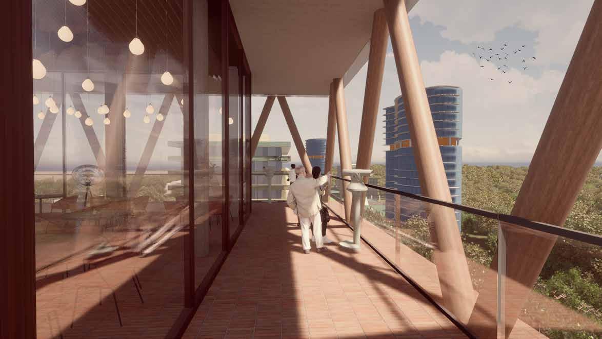 Op de rooftopbar heb ik een optop ping gevoegd. Deze optopping bestaat uit een dubbele translucente wand waardoor je met een flauwe trap je weg omhoog vervolgd. Nadat je door het vierkante volume je weg omhoog vervolgd hebt, kom je uit in een gro te rechthoekige ruimte met afgeronde hoeken. de wanden zijn aan alle kanten omsloten en bestaat uit één groot tv scherm. Hierop worden 360 graden pro jecties afgespeeld, dit zorgt voor een 3D ervaring. De trappen hebben een neerwaartse trechtervorm waardoor het lijkt alsof je afdaalt in een Colosseum. Het volume wordt afgesloten door een dak met een glazen constructie. Deze constructie bestaat geheel uit glas waardoor de binnen-buiten ervaring zo transparant en optimaal mogelijk is.