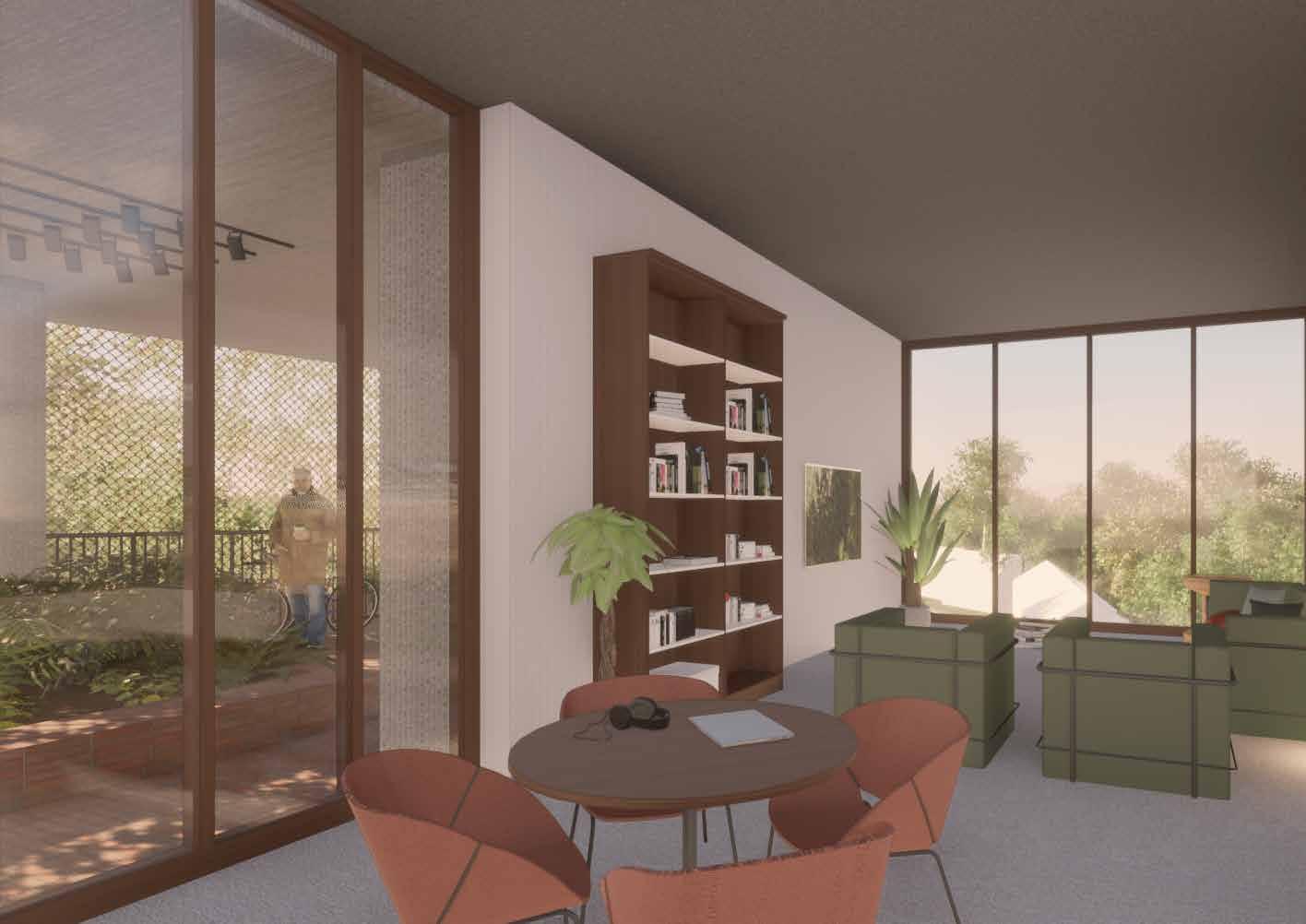 Wat duidelijk naar voren komt is dat de grenzen tussen werken en wonen steeds meer vervagen. Mensen worden flexibel en willen zelf de balans tussen werk en privé bepalen. Het scenario ‘weinig mensen’ zorgt er voor dat er niet veel mensen in het gebouw zullen worden gehuisvest waardoor er meer ruimte overblijft voor architectonische ingrepen en buitenruimte van de wo ningen. Dit zorgt ervoor dat men dicht bij huis een plek heeft om voor een private invullingen.