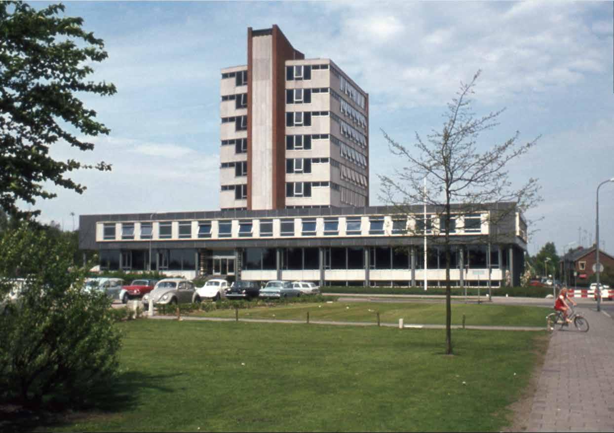 Het gebouw na kort na realisatie: De omliggende omgeving is vrijwel onveranderd. De bestaande parkeer plaats tegenover het gebouw is er nu bij betrokken om bezoeker en bewoner van een parkeerplek te voorzien.