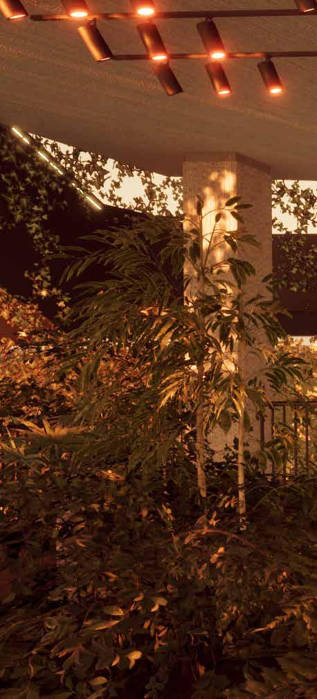 welke bijna mediterraan aan doet. Om de planten voldoende te laten groeien is er extra licht aangebracht. Vanuit het plafond schijnen speciale groeilampen op de planten die er voor fotosynthese zorgen. Hierdoor ontstaat er ‘snachts een oranje/rode gloed wat een myste rieuze sfeer teweeg brengt. Zo ontstaat er een extra groot contrast tussen het intieme en aangename overdag en het grillige / mysterieuze s ‘nachts.