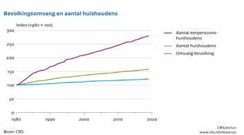 Het aantal huishoudens is de afgelopen decennia sterk gegroeid, van 5,1 mil joen in 1981 naar 7,4 miljoen in 2010. In 2020 zal dit met een half miljoen zijn toegenomen tot 7,9 miljoen. De stijging is voornamelijk toe te schrijven aan het feit dat mensen steeds vaker, al dan niet tijdelijk, alleen wonen. Dit geldt voor zowel jongeren als ouderen. Er ko men steeds meer 65-plussers alleen te wonen, jongeren gaan na het verlaten van het ouderlijk huis alleen wonen en (echt)scheidingen vinden vaker plaats 1 1 https://www.cbs.nl/nl-nl/gezinnen in beweging
