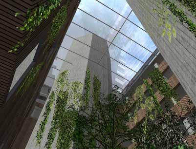 De woontoren is geheel open en wordt enkel omhult door stalen netten wel ke begroeid zijn. Doordat de toren met minder woningen gevuld is blijft er meer ruimte over voor andere invul lin-gen. Een belangrijk onderdeel zijn de tuinen, intern zijn grote planten bakken gemaakt, waarin verschillende planten groeien. Hierdoor ontstaat er een intieme aangename leefwereld