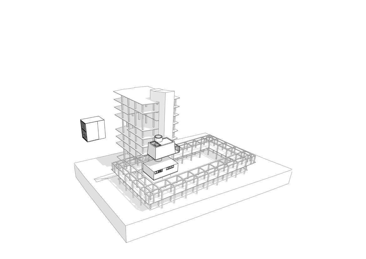 Het gebouw heeft een herkenbare verschijningsvorm. Dit wil ik zo veel mogelijk benadrukken. Dit zou ik kun nen doen door de constructie van het gebouw los te maken van de schil waardoor het een puur en rauw karak ter kan krijgen. Hier zal ik later verder op ingaan met een analyse van de ver schijningsvorm.