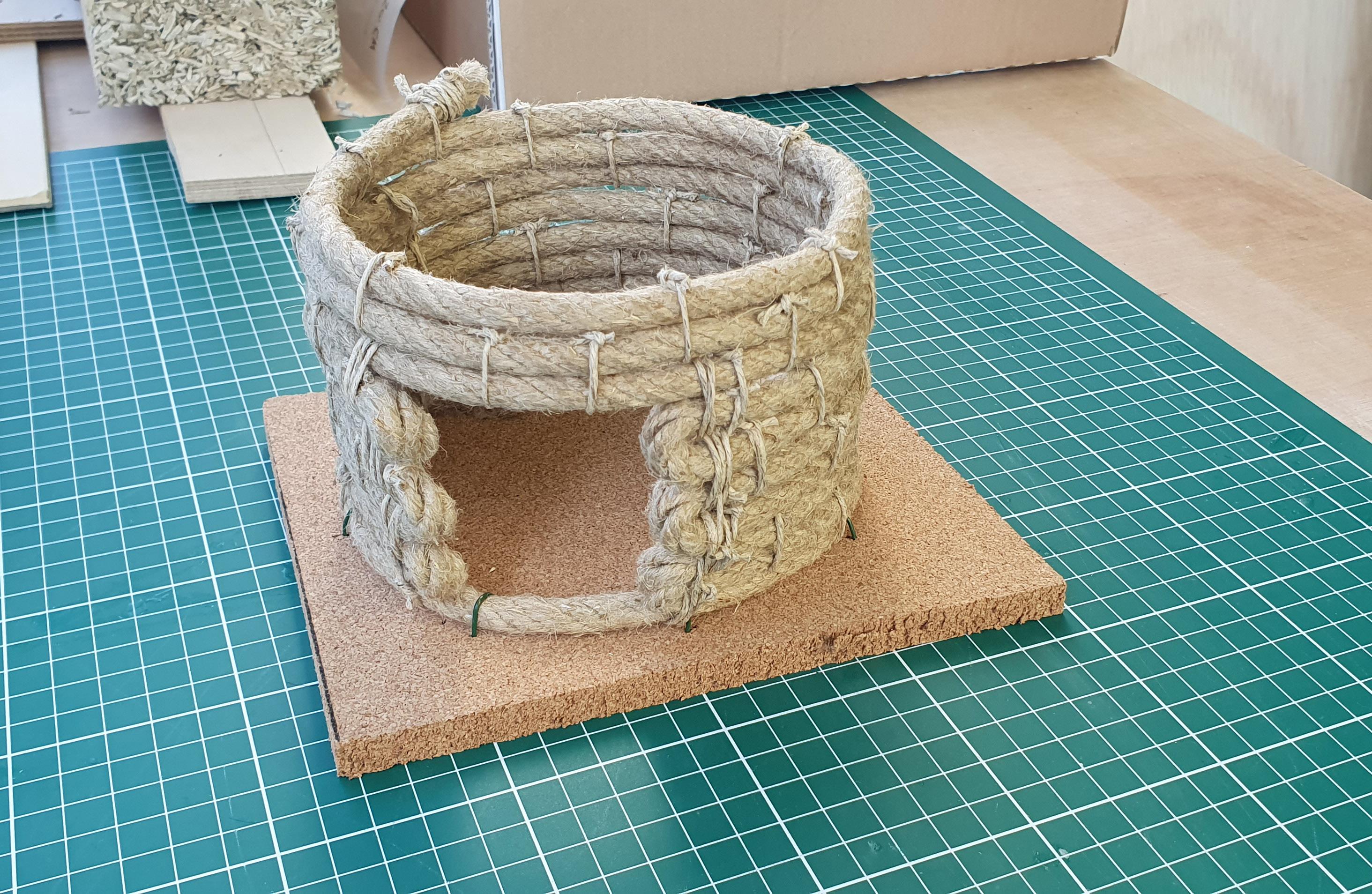 Studiemaquette, onderzoek follie van touw rond kolommen.