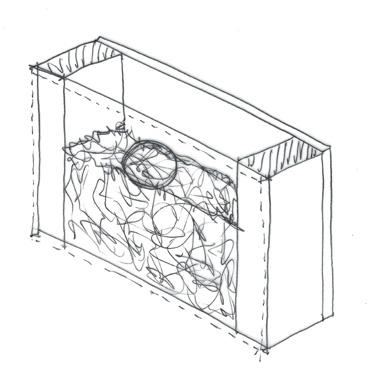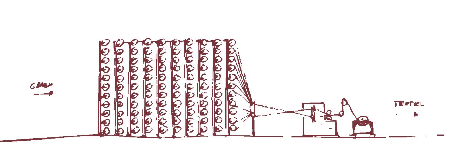 Conceptschets, productiestappen als zichtbare showcase geprojecteerd op locatie.