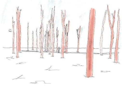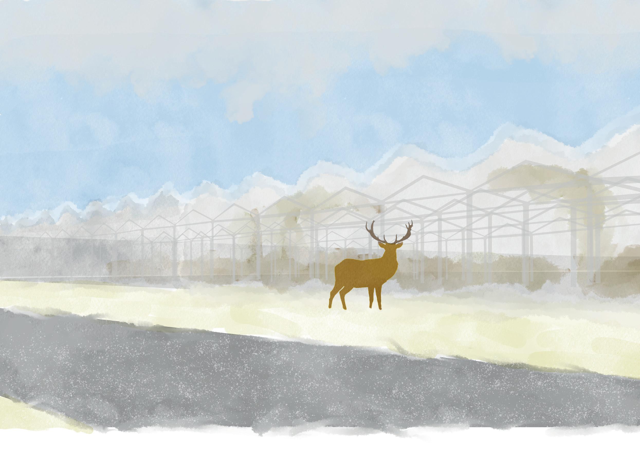 JAGER: Eenmaal bij de rand van het bos merk ik tot mijn verbazing dat het hekwerk verdwenen is. Ik zie een edelhert net de kassen in vluchten, over het gebroken asfalt. Tussen de struiken die in de kassen groeien, of wat er dan nog van over is. Het lijkt alsof het geheel opengebroken is. Een nieuwe doorgang. Maar waarvoor en waar naartoe?