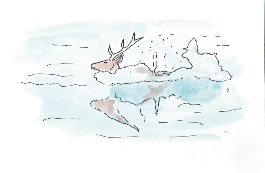 EDELHERT: Onze vacht is bedekt met een laagje vocht; we voelen de kou terwijl het licht langzaam tevoorschijn komt. We begeven ons naar de waterkant, want het is tijd. Samen met de andere mannelijke edelherten maken we ons klaar voor de oversteek. Aan de overkant wacht nieuwe kansen om te imponeren, te vechten en te paren. Met krachtige slagen van onze hoeven betreden we het water. De stroom omspoelt onze lichamen, onze vacht doordrenkt door water en kou. We zwemmen krachtig door, onze ogen gericht op de overkant. Elke beweging is berekend, want we zijn nog steeds een prooi voor gevaar. Anderen loeren misschien vanaf het droge, klaar om misschien te profiteren van onze kwetsbaarheid. We bereiken de overkant. We beklimmen de rand, onze lichamen trillend van de inspanning en de kou. We schudden het water uit onze vacht. Voorzichtig trekken we verder de bossen in, klaar om onze orde te bepalen en ons territorium af te bakenen.