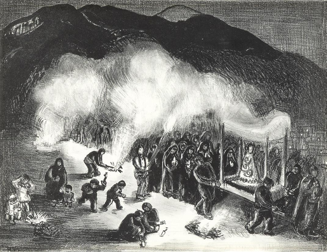 Gene Kloss (Alice Geneva Kloss) was a leading American printmaker celebrated for evocative etchings and aquatints of Taos Pueblo life, Northern New Mexico ceremonies, and high-desert landscapes. Born in Oakland, California, she studied at UC Berkeley and first visited Taos in 1925, later dividing her time between California and New Mexico before settling permanently in Taos. Working almost entirely on her own press, she produced 600+ plates—etching, drypoint, and aquatint—distinguished by rich chiaroscuro, luminous tonal ranges, and an unusual sensitivity to sacred subjects (Penitente rites, Pueblo dances), typically portrayed with dignity and restraint rather than spectacle. Kloss contributed prints to New Deal art programs in the 1930s and was one of the few women of her era elected to the National Academy of Design. Though she painted in oil and watercolor, her reputation rests on her masterful intaglio prints, which are held in major collections nationwide.