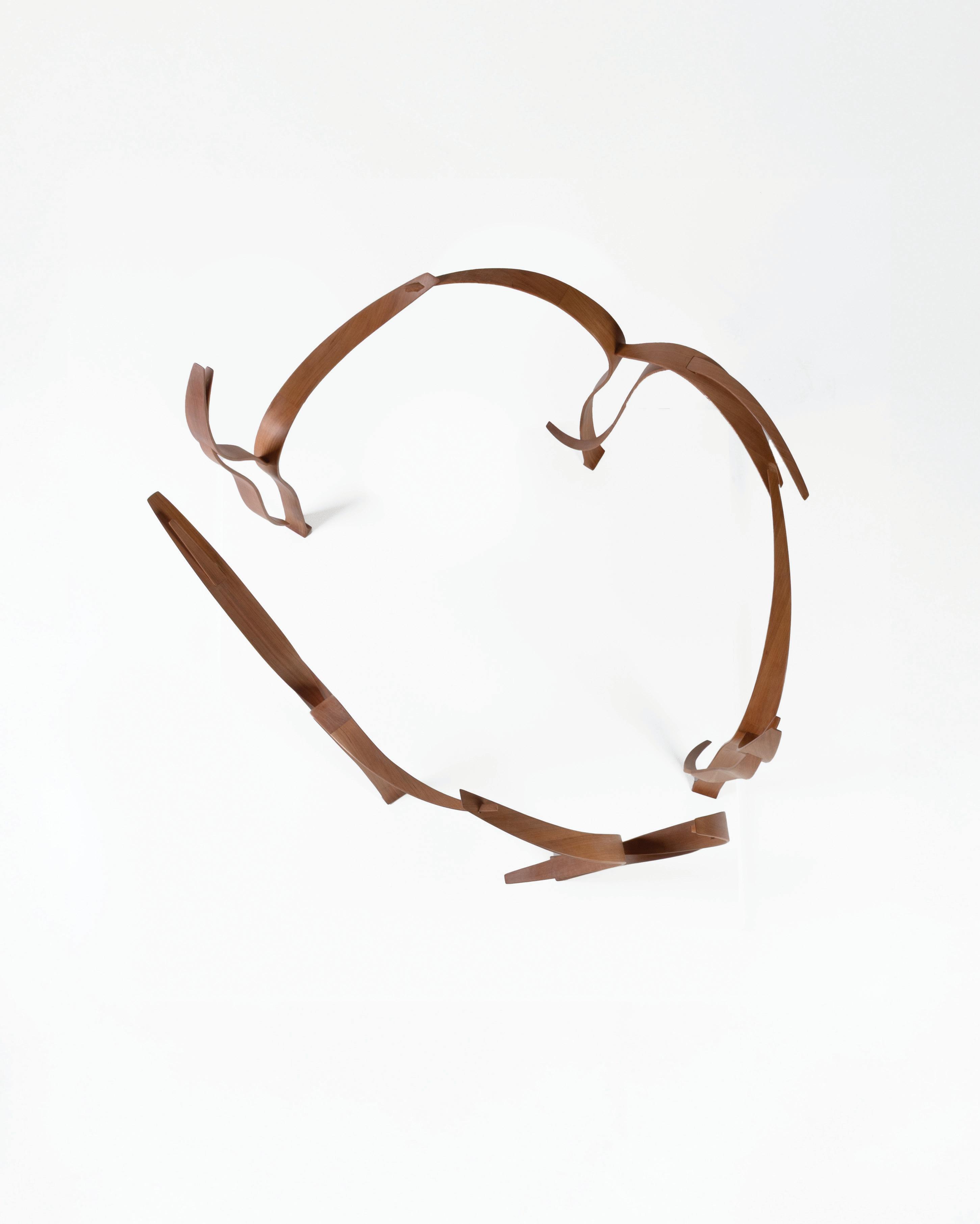 Clift’s practice has now evolved to explore mutually reliant groupings, such as Centripetal, Centrifugal and Forms on a Catenary Curve. Both gain their resilience through connection, not isolation. In Forms on a Catenary Curve, two parallel cables held at either end curve down to the middle, with five forms balanced like acrobats on a high wire. All possess the same three elements and points of connection, but an angle changes in each to shift the overall weight and gravity of the piece, allowing it to adapt to the different angles on which it stands to achieve equilibrium. In Centripetal, Centrifugal, five opposing forms seemingly gyrate, yet, while the individual pieces are out of equilibrium, as a group they remain upright. The theme of mutual reliance is intrinsic to Nested, a smaller version of a 10-foot tall steel sculpture, commissioned for Baptist MD Anderson Cancer Center, Florida, in 2018. Nested symbolizes a relationship of care – a doctor and patient, or mother and child – while each form steps out in rotation away from the other, suggesting protection, but also a separation from the unit.