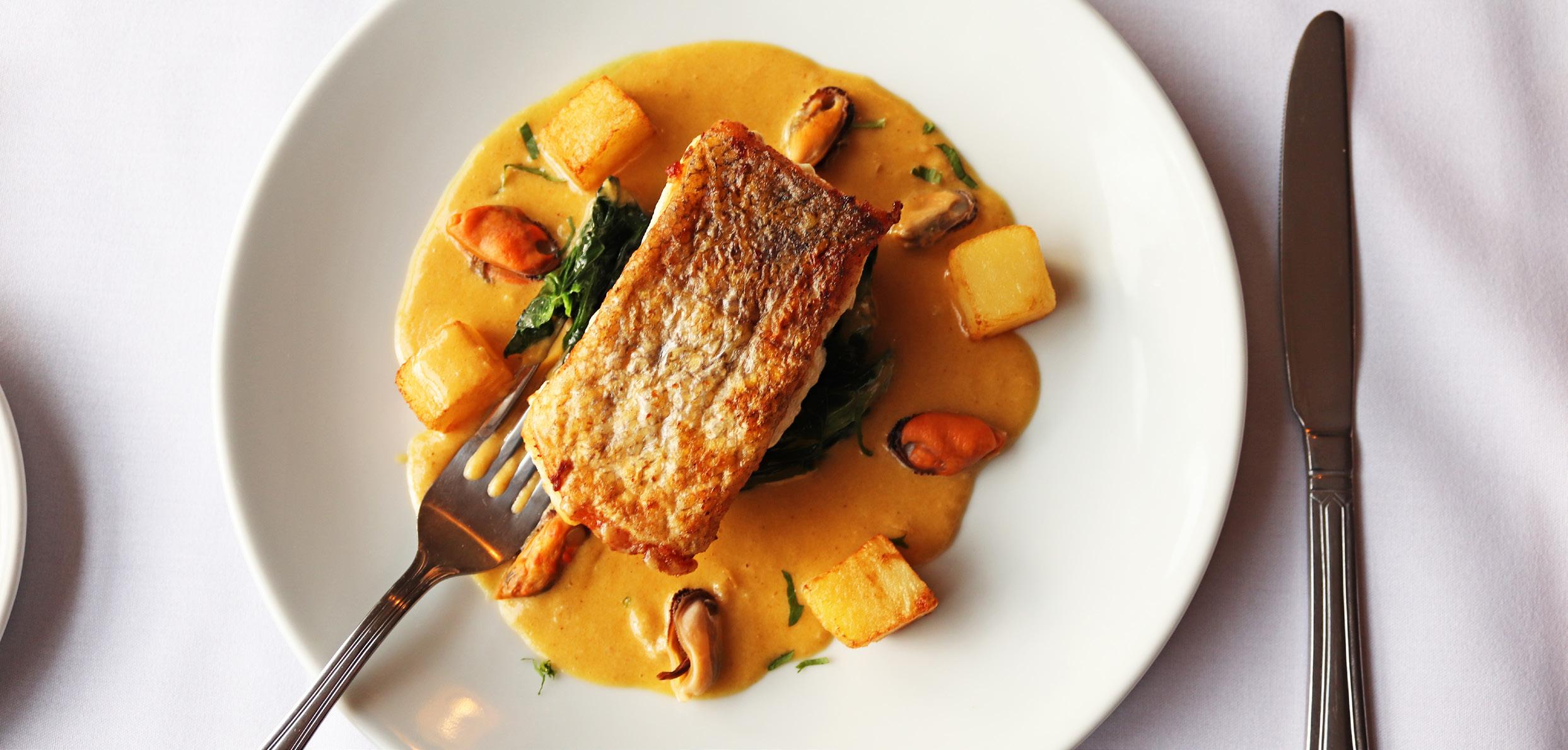 Grilled seabass fillet sautéed potatoes, spinach, and lemon dill hollandaise