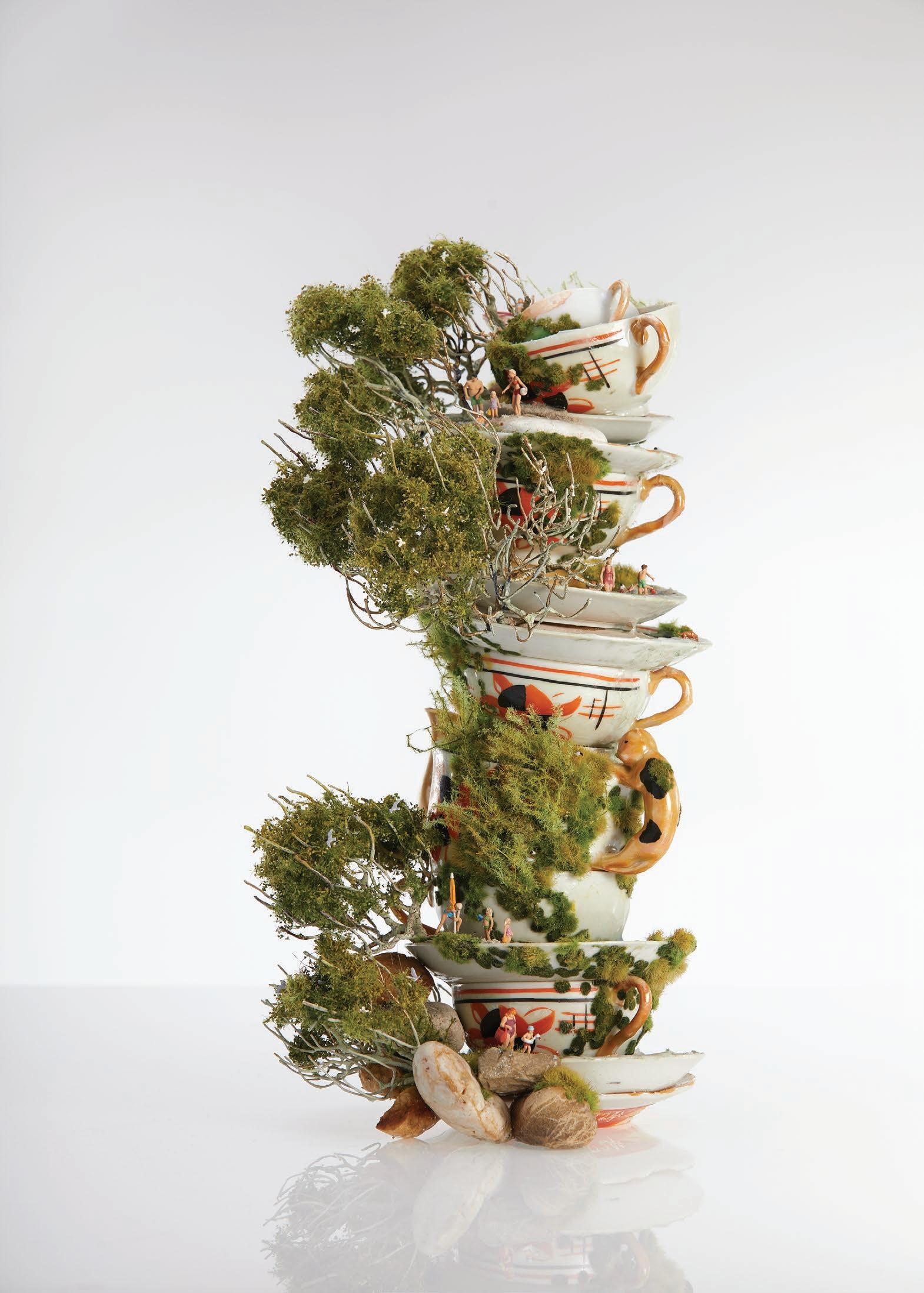 acrylic, Hydrostone and cane on hand-carved reclaimed hardwood