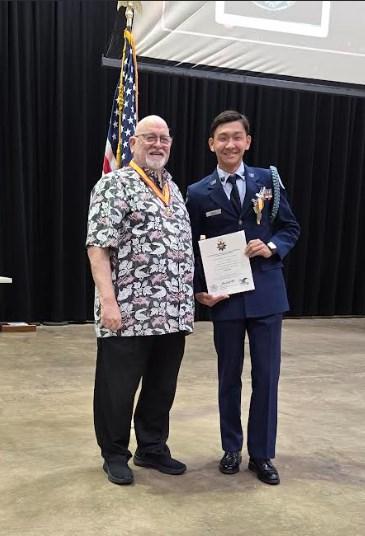 Photos L R: Lt Col, USAF, Ret. Craig Chang INDOPACOM J6, presents the Silver Academic Medal to Cadet, and the Bronze to Cadet at Aiea. Companion Fred Staedel presenting to Cadet Sarah Marsh and Cadet Frank Price at Kaiser AFJROTC,