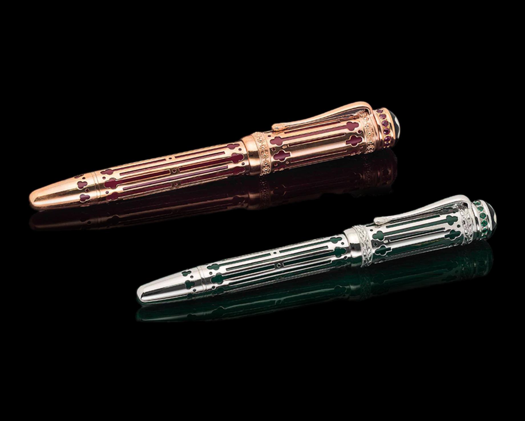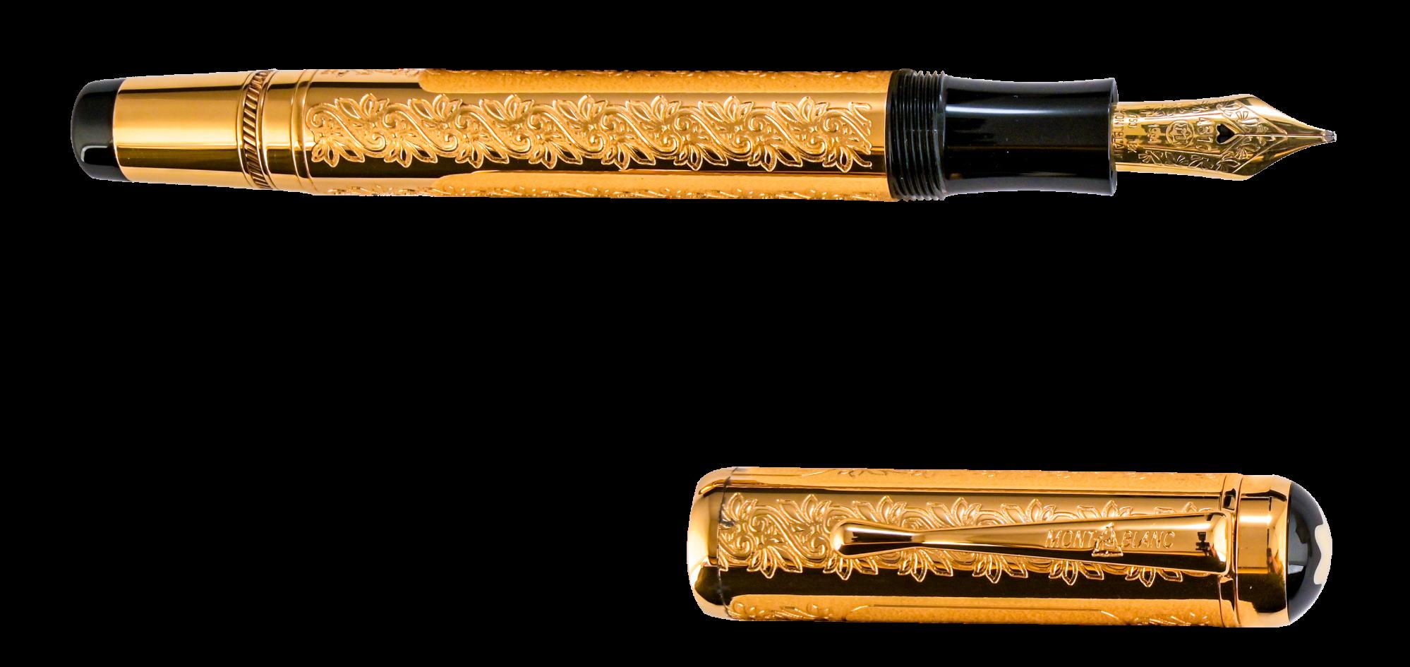 Launchedin1995,theMontblancPatronofArtEditionThePrinceRegentislimitedto4,810fountainpens.Itpaystributetothis Britishkingandpatronoftheartswithapenoftrulyregalappearance.HisappreciationforthefineartsshapedBritishcultureto histaste,andartformsfromtheperiodofhisreignareknownasthoseofthe"Regencyperiod".Afascinatingfretworkpattern windsoverthedeepbluepreciousresinbarrelofthepen–ingold-plated925sterlingsilver.Thecapisdecoratedbyacrownwhose delicatecompositionrecallsthekeeneyefordetailofroyalcraftsmenofthepast.The18Kgoldnibisbeautifullyhand-engraved withtheinsigniaoftheBritishmonarchyintheRegencyperiod.
