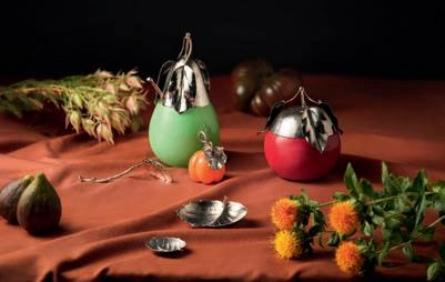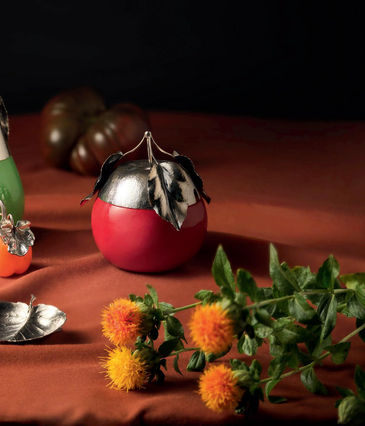 Nature, this time ora, also inspired what is perhaps Buccellati’s richest and most celebrated tableware collection. Nature is a triumph of leaves, owers, fruit and vegetables, crafted into objects that are either purely decorative or also functional. It is an inclusive collection, although the standard is always one of excellence: prices range from a hundred euros for charming little placeholders to impressive sculptural centrepieces, such as the incredible arrangement of