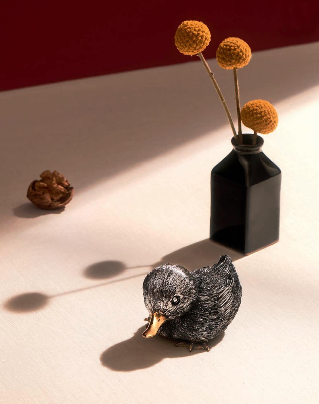 As demand continued to grow – in the early 1980s, Buccellati took over Clementi, a renowned silver cutlery manufacturer based in Bologna –Gianmaria’s fertile creativity broadened and enriched the range. Under his impetus, the maison’s master goldsmiths ventured into innovative and daring technical explorations. e most striking example of this quest is the Furry collection, relaunched during the latest edition of Milan Design Week. “I was looking for a process that had never been used before,” explained Gianmaria Buccellati when this stunning collection of small and large silver animals was rst presented in the 1960s. “A way to recreate nature with even greater accuracy and realism, capturing details such as feathers and animal fur.” As simple as the result may appear, achieving the e ect of fur involves hours of meticulous work and hundreds of ultra-thin silver layers, all carefully laid onto a plaster mould.