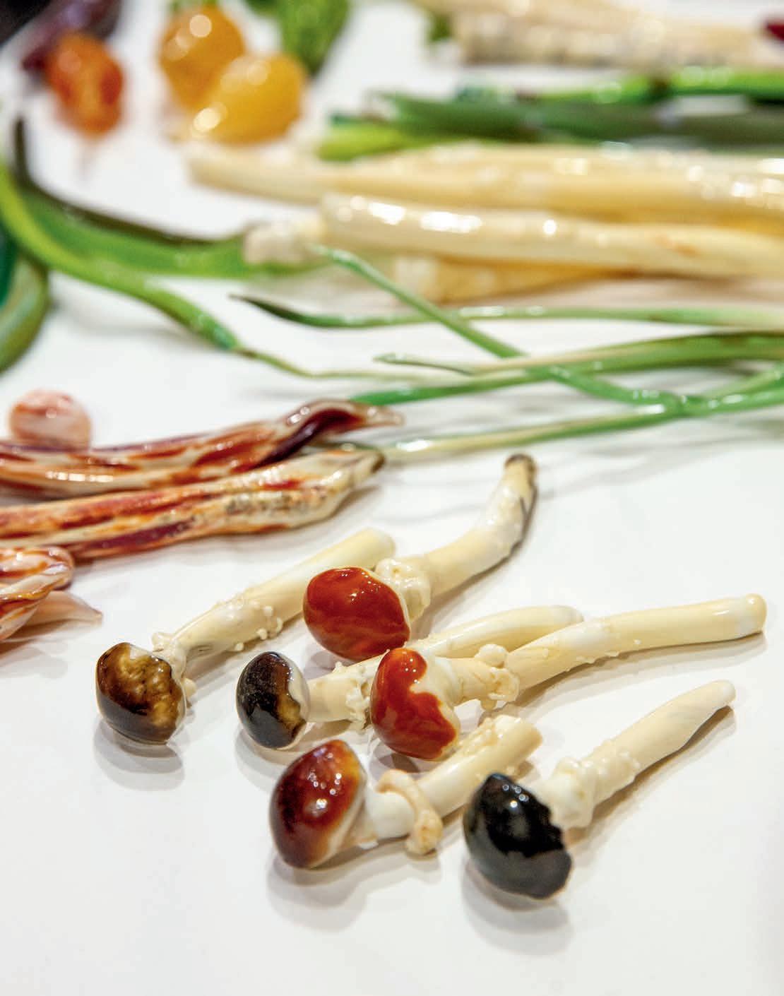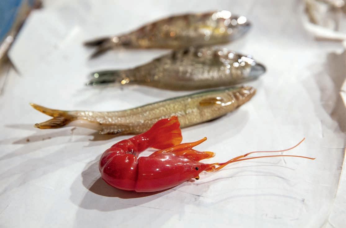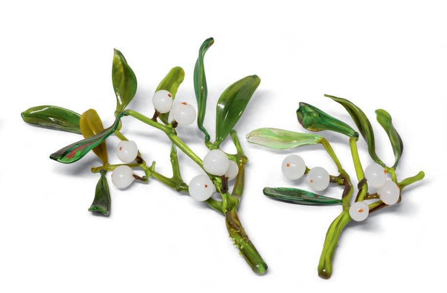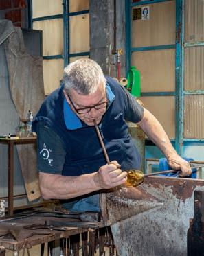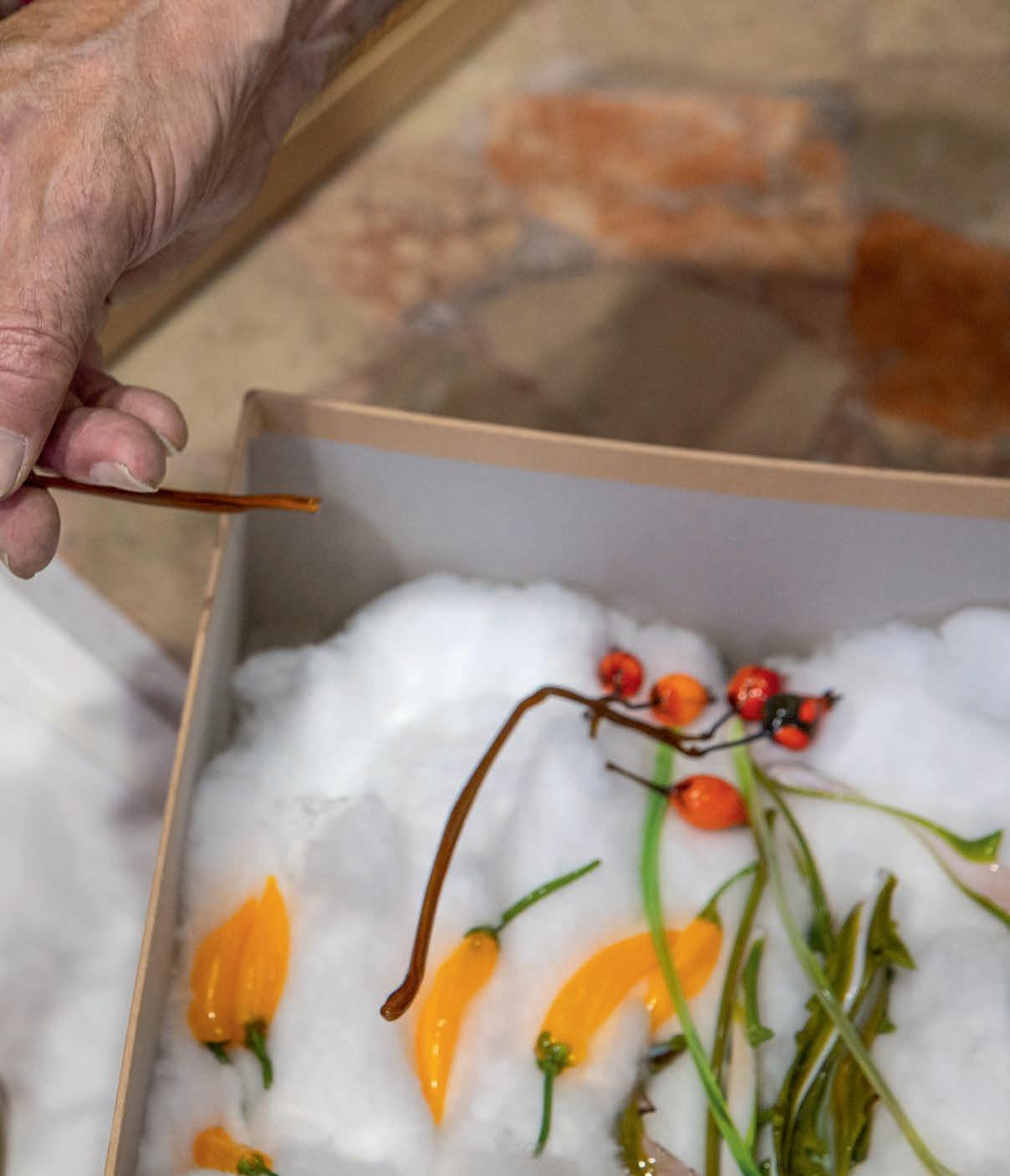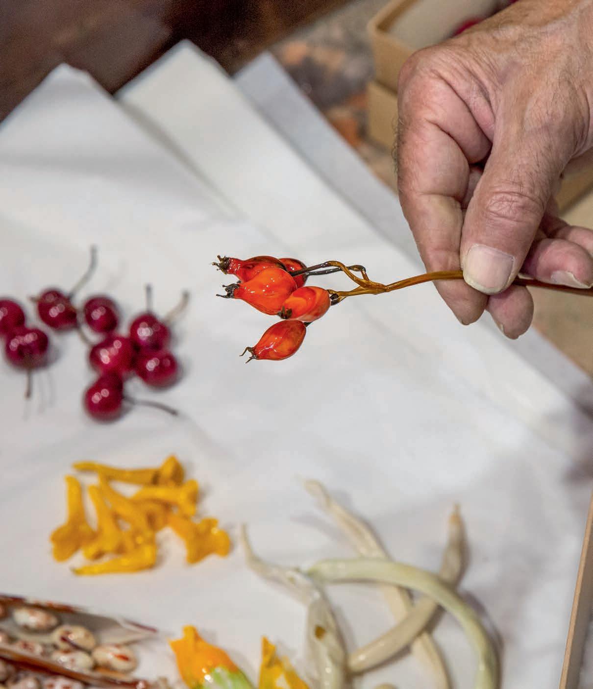 Amadi enjoys his creative freedom: the objects he sculpts are based on his observations of the real world, as well as photographs and drawings. He does not like serial work, preferring to follow the impulse that still sparks his imagination: “If I buy some grapes, I look at them, eat them and then try to reproduce the individual grapes, capturing their shape, colour and transparency. I am satis ed when each glass element looks just like its real-life counterpart.” One of the most crucial phases is mixing the right colour for each element, which is done by combining several rods of Murano glass over a blowtorch. ough colours are now “standardised”, Amadi explains that “ fty years ago, you would get a di erent shade of the same colour from every furnace, since each one developed its own unique palette. On top, the colours were more vibrant because everything was done by hand, while today they are all machinemade and uniform.”