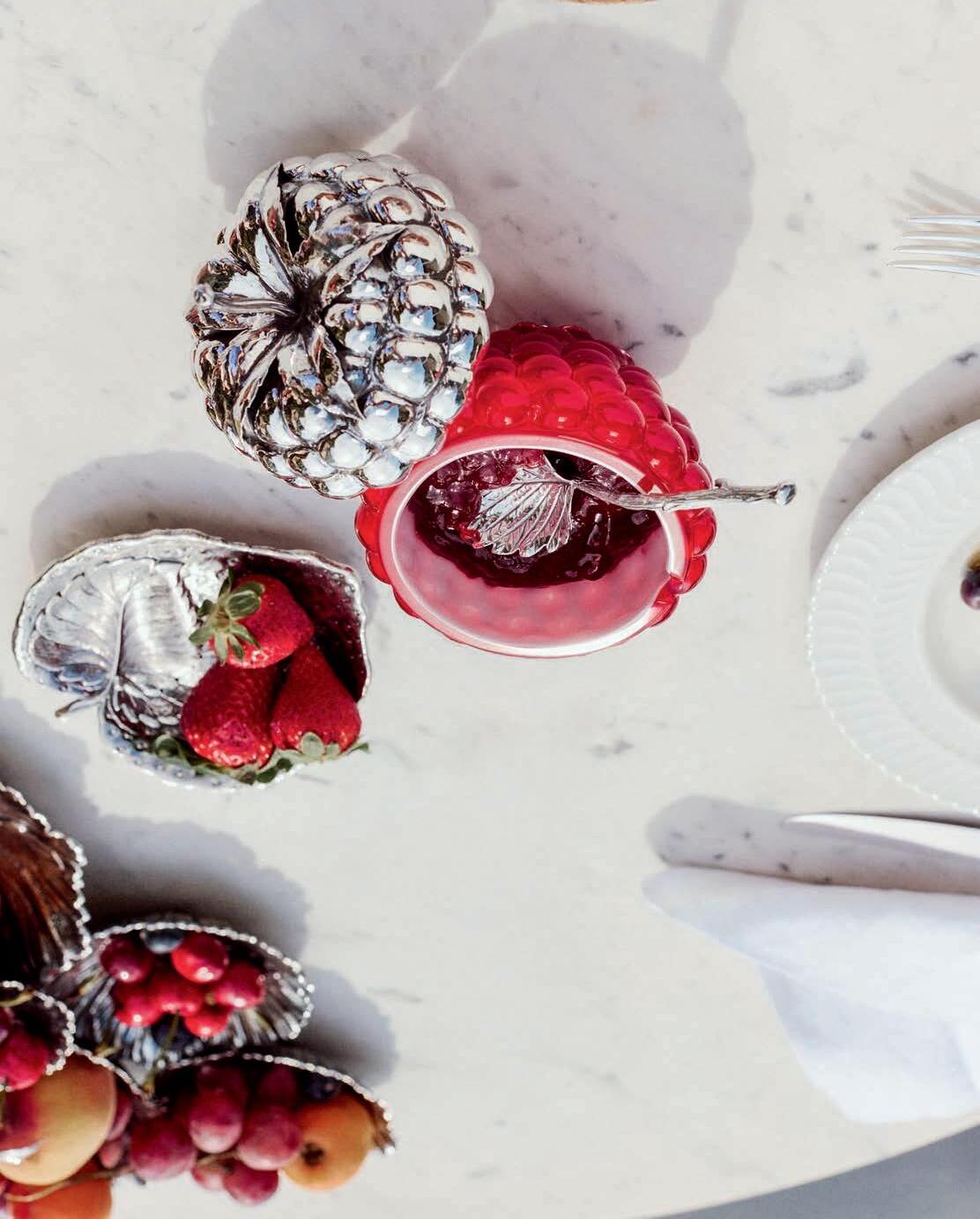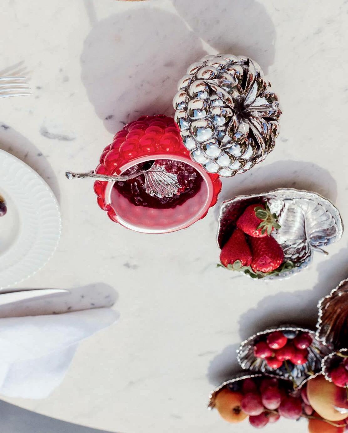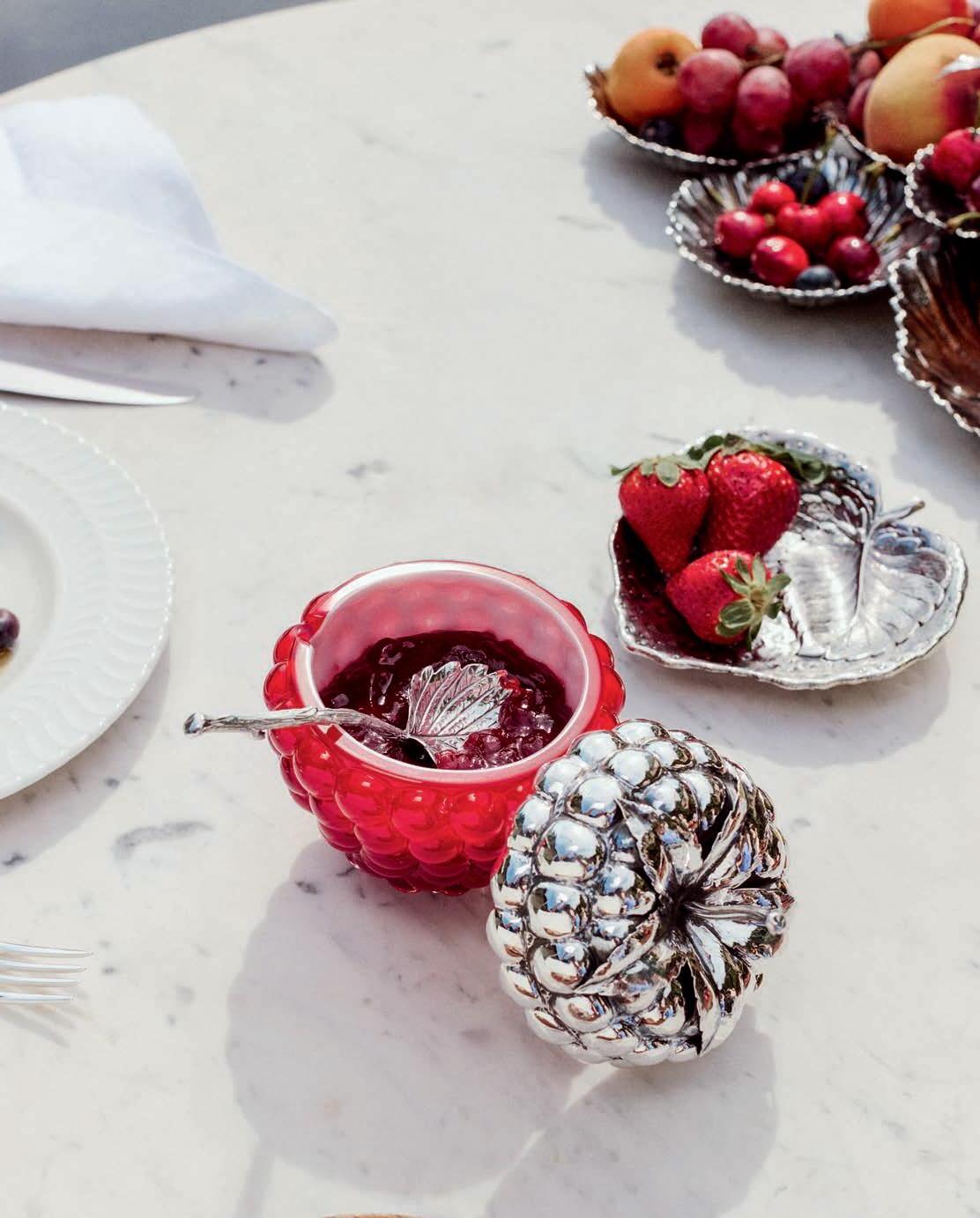 Driven by entrepreneurial spirit, Gianmaria and his sons—and today, the creative team appointed by the Richemont Group (which acquired the brand in 2020)—expanded the range by combining silver with porcelain and glass, in some cases in partnership with other equally historical and prestigious manufacturers. As a result, the signature draping of the Rouche collection extends beyond the rims of silver trays and platters to adorn porcelain tableware created in collaboration with Ginori 1735. Similarly, Rosso Meraviglia is a contemporary tribute to Buccellati’s distinctive sculptural designs and Venini’s iconic red glass, crafted in the world-renowned Murano glassworks. Murano is also the name of another “co-ed” tableware line blending glass and silver in multiple designs, including the charming fruit-shaped Jam Jars, ideal containers for delicious breakfast preserves.