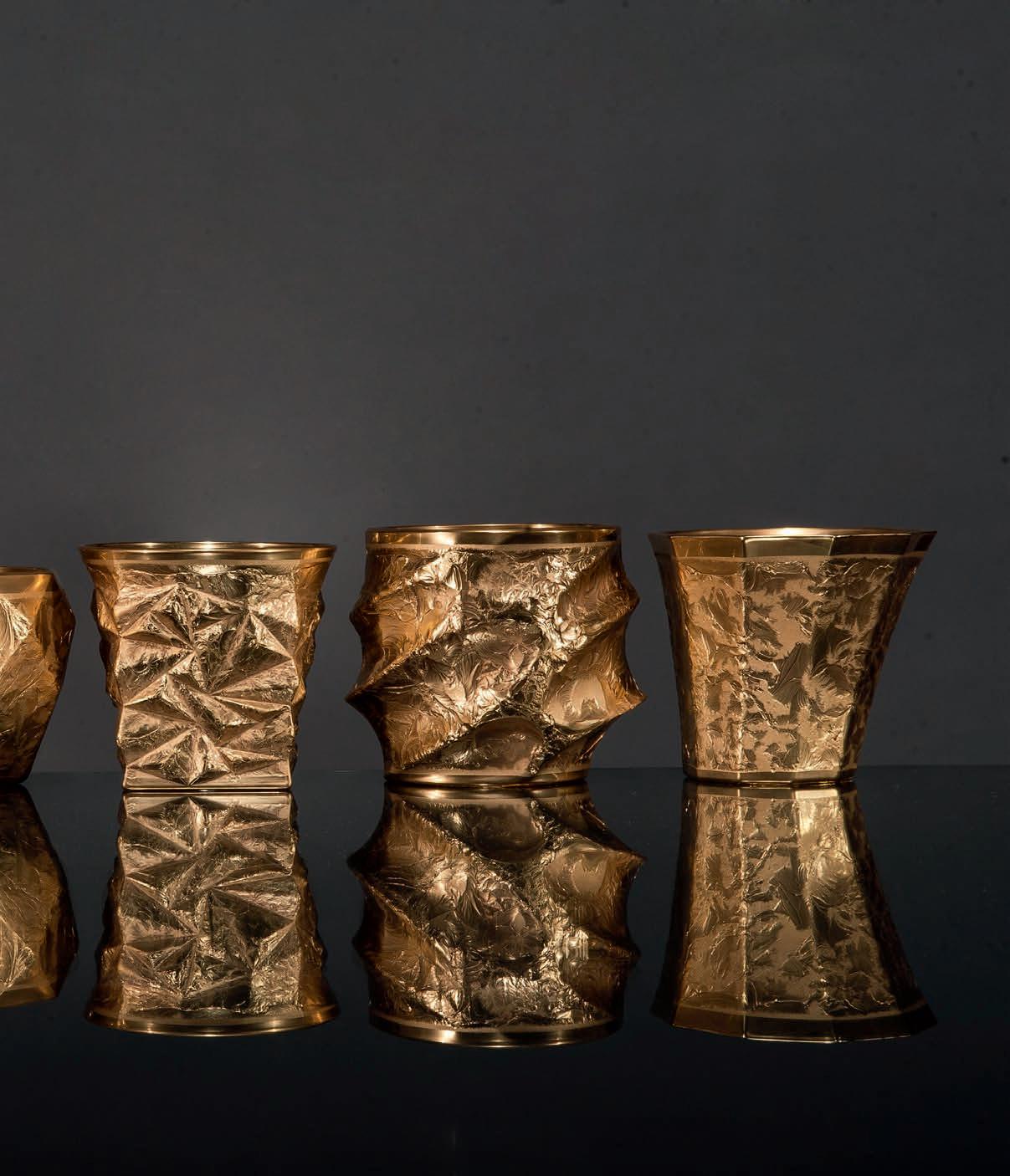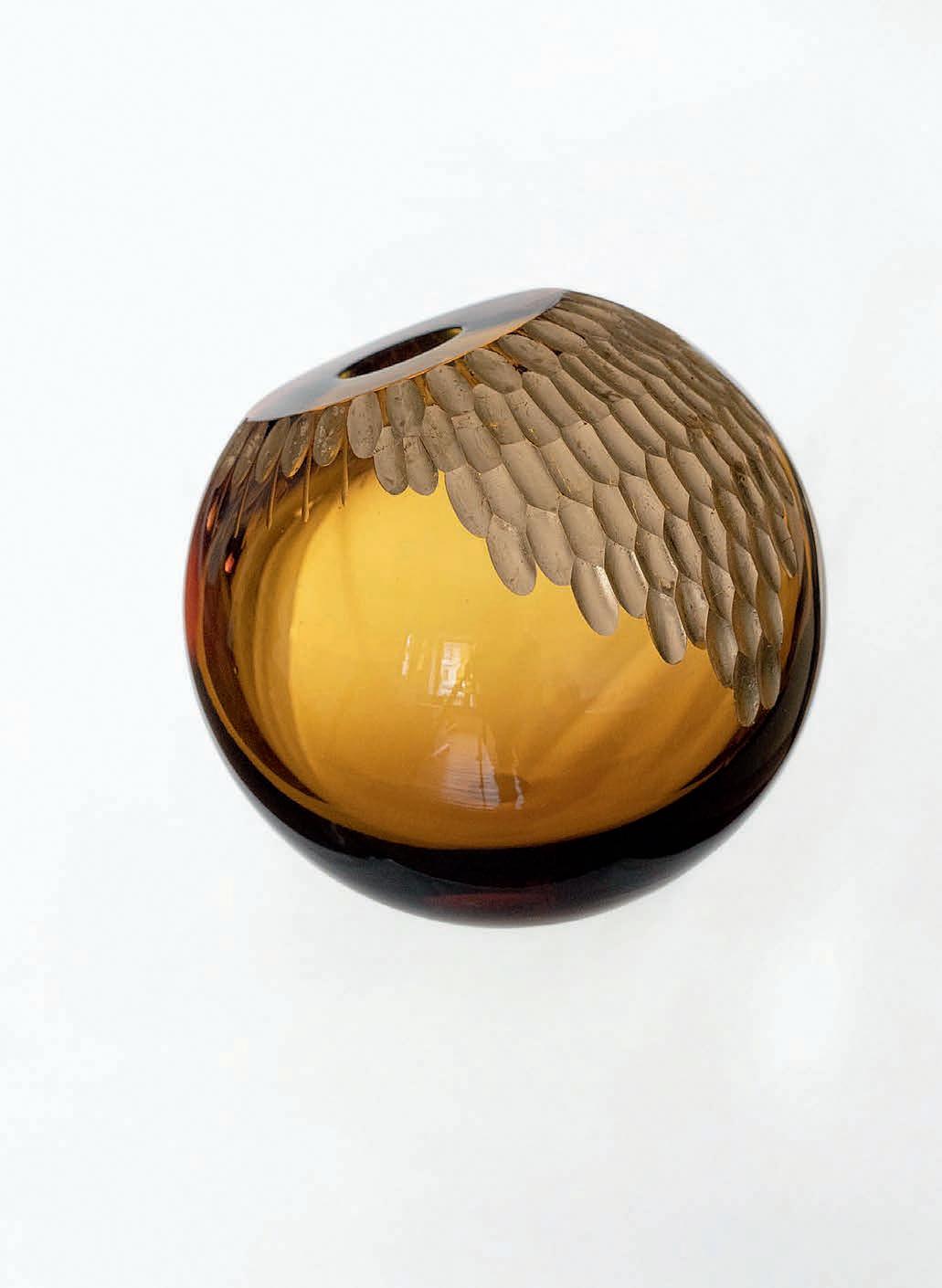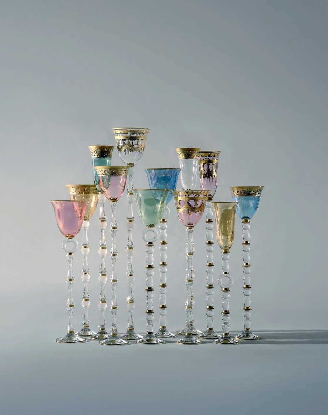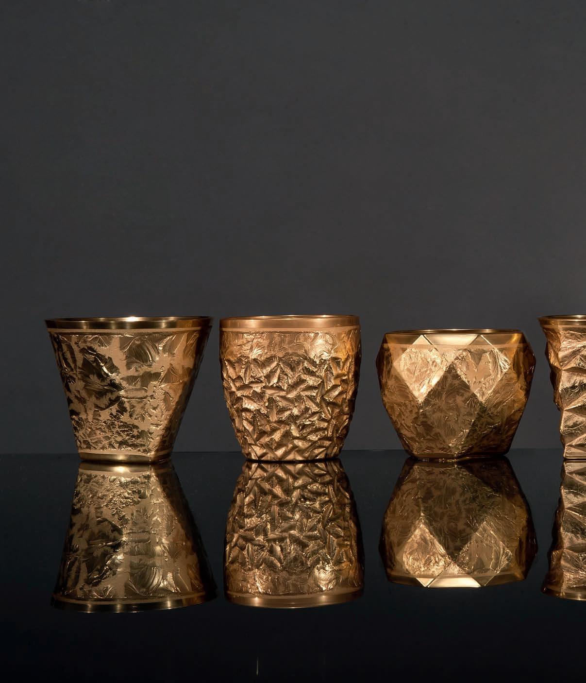 Human gures, landscapes, owers, grape bunches, animals, ballerinas, shells, commemorative motifs, delicate geometric patterns, coats of arms and monograms—all engraved into the glass—give lightness, depth and brilliance to blown crystal, illuminating the most elegant tables. In her latest work, Vanessa has also introduced gold leaf, re ecting her passion for experimentation and innovation.
