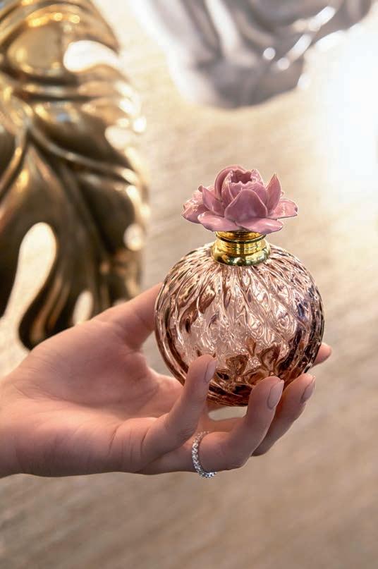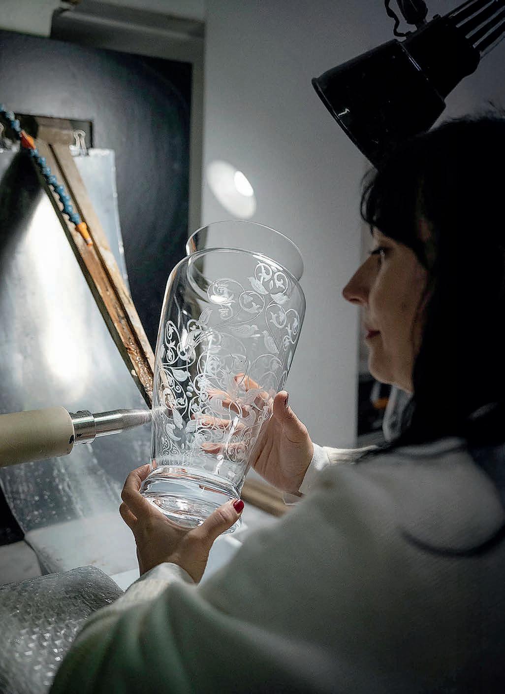 and knowledgeable expert. In his studio and shop, where he ran a thriving business for years, I had the opportunity to discover and admire Europe’s nest crystalware, which I promptly fell in love with. He also took me on many of his travels, exposing me to a world of beauty that shaped me,” she reveals with a mixture of pride and longing. She remembers how her father preferred to teach women, believing that feminine sensitivity and re nement imbued the work with an unrivalled touch. Although the world of glass was traditionally maledominated, his open-mindedness played a crucial role in nurturing her talent. When asked about her technique, she explains: “I engrave the surface of glass or crystal using a lathe tted with a stone wheel. Pressing the vase, goblet or any other object to the wheel, I create a bas-relief. Once engraved, it cannot be changed, and there is always the risk of piercing the surface in the process. But with experience, mistakes are avoided. I work with blown glass and crystal, both hollow and at, and I particularly enjoy working on extra-thin pieces.”
