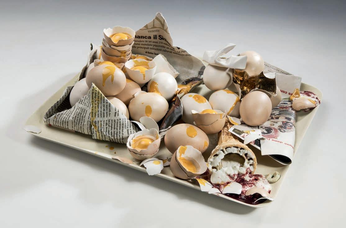 eir large-scale works—installations in their own right—are accompanied by equally fascinating “quasi-domestic” objects: “almost”, because they are invariably imbued with surreal references and a dose of irony. e observer is engaged on multiple levels, from the environmental to the microscopic. Stacks of bones, bins over owing with rubbish and crawling with snails, mirrors, trays with leftover food and patches of grass littered with gruesome debris are some of the features characterising their work in the 2000s. e rst signs of this modus were visible in the “accumulations” they developed in the 1980s, such as the tray with co ee cups, which speak of a consumption-driven society. Composizione 1 (2011), depicting a stork and its nest resting on a tower of batteries, emblematically captures this spirit.