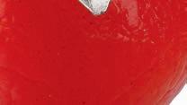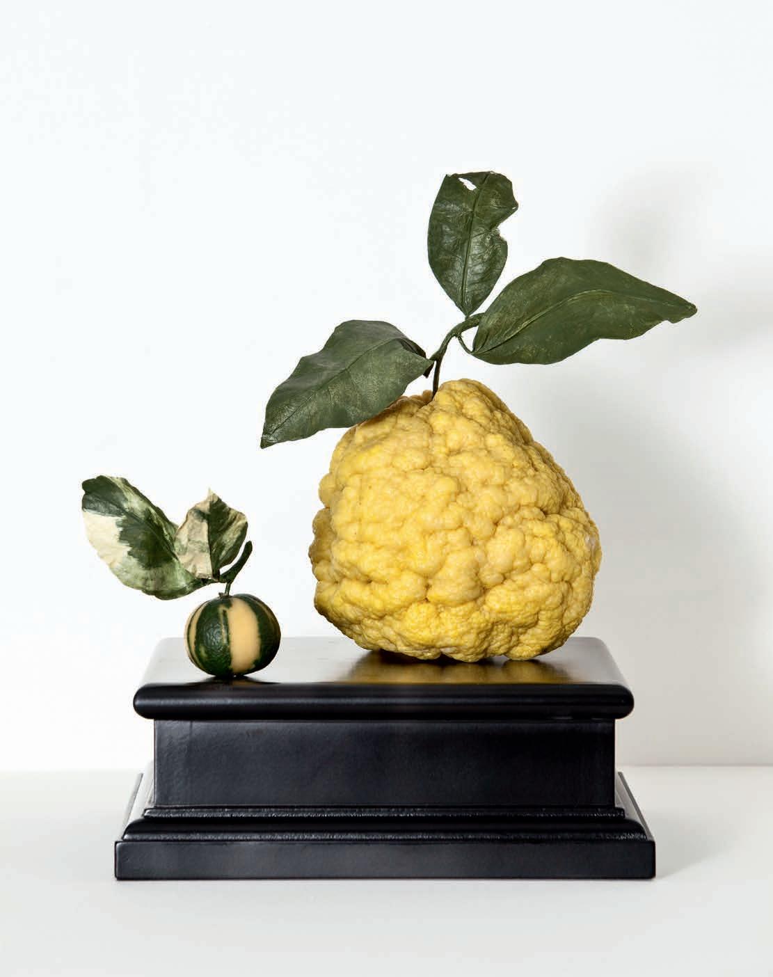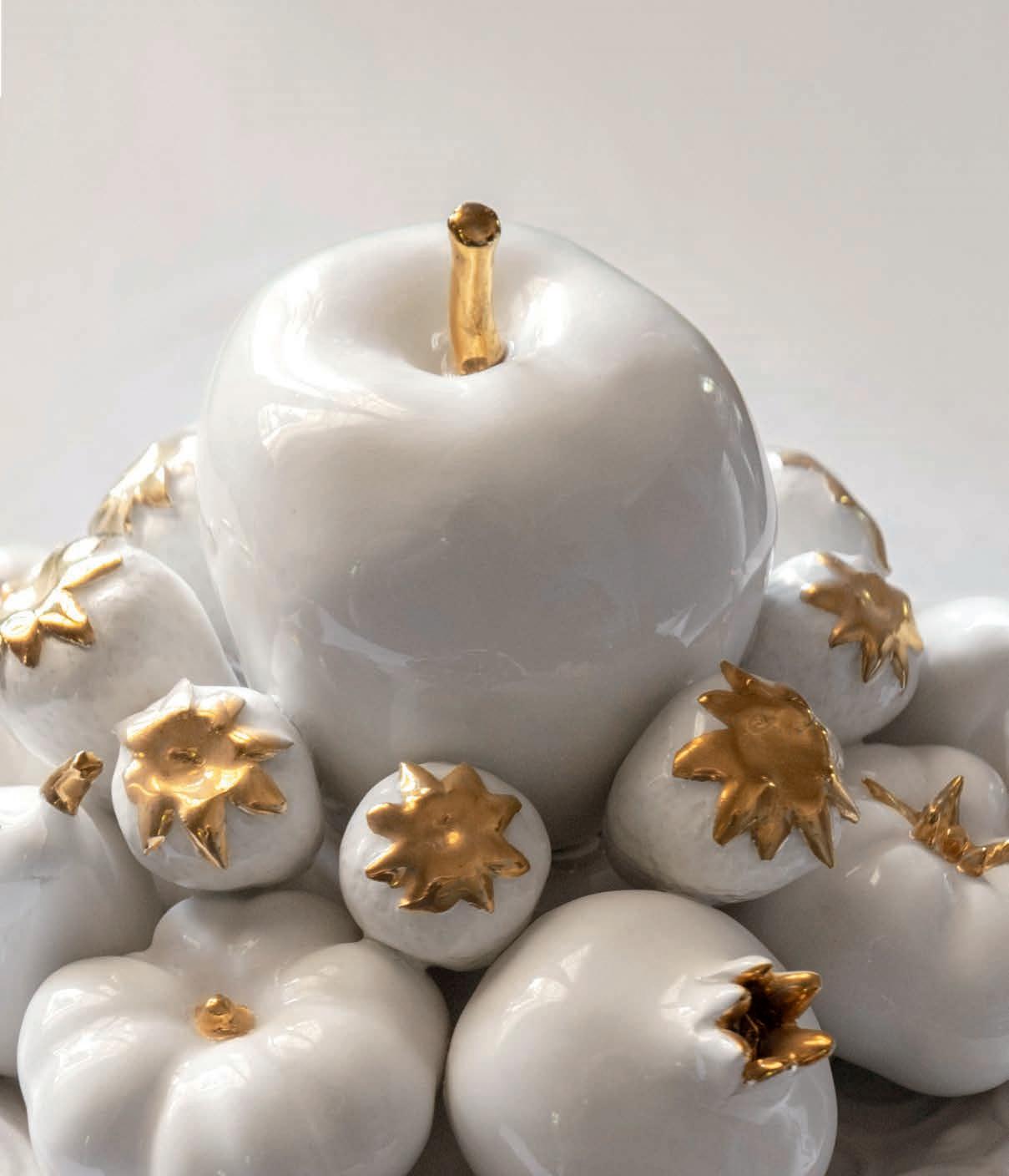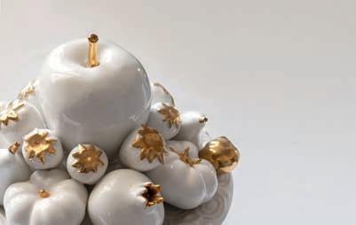 Paola Nizzoli explains, “where you start with a wax gure that is then used to make a plaster cast into which bronze is poured. Whereas I create a mould rst by covering a piece of fruit with plaster or silicone rubber, which I then carefully remove and ll with wax. Once the moulds are completed, the process of creating the models themselves depends on the complexity of each individual fruit. An apple, for example, takes around ve hours to complete, a sliced pomegranate requires two to three workdays, while a bunch of grapes can take up to ten days, because each single grape is modelled and painted with di erent colours and glazes before it is attached to the stem, which I fashion from brass wire coated with gummed paper.” Nizzoli’s peaches, too, are quite remarkable: their velvety surface is obtained through a process involving the sprinkling of wool powder, which lends the skin its distinctive texture.