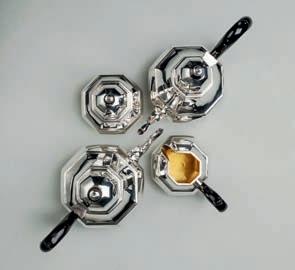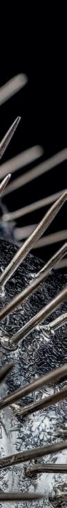 Buccellati art de la table became an essential feature of upper-class dining rooms in the 1950s, when Mario’s son Gianmaria joined the company and their rst New York store was opened on 51st Street. anks to the imagination of the new creative director, Buccellati’s signature lines continued to expand, harmonising with di erent styles, from the most sophisticated to the more casual. e opulence of Opera, in which the maison’s logo is replicated to form an exquisitely crafted pattern, is complemented by the objects in the Cervino line, in which deer antlers engage in an audacious dialogue with silver, giving rise to objects of outstanding functional beauty.