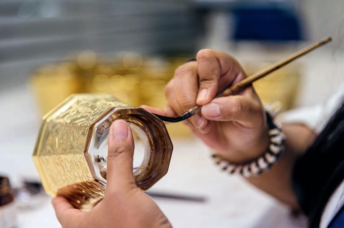 Since opening her atelier in the heart of Altare in 1993, Vanessa has specialised in tableware—goblets, glasses, jugs, bottles, decanters and plates—as well as decorative objects such as vases and sculptures. Many prestigious home décor brands rely on her expertise, including Dior, which entrusted her with the creation of exquisite dinner services. She admits to a particular fondness for glasses in all shapes and decorative styles: “I am especially drawn to coats of arms, which I reinterpret in many ways to adorn a category of tableware I deeply value for its ability to combine functionality and decoration in a magni cent way.”