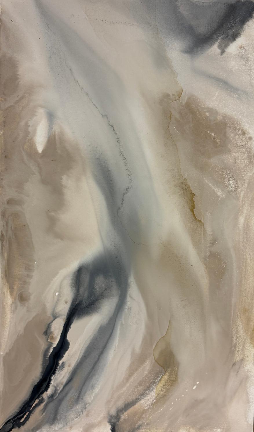 Paulina Sanchez's two large acrylic works share a language of fluid geology — of stone and water and the slow, patient movementofnaturalforces.ReleaseMefillsitstallcanvaswith a surface that looks like tidal flats seen from above, rivulets of grey and sand branching outward from a central surge, dark pools gathering in the hollows. A New Dawn offers a quieter counterpart: soft veils of cream, taupe, and pale blue drift and layer like mist over marble, the whole surface luminous and still. Both works have the quality of something vast made intimate,andtogethertheyfeellikebreathinginandbreathing out.