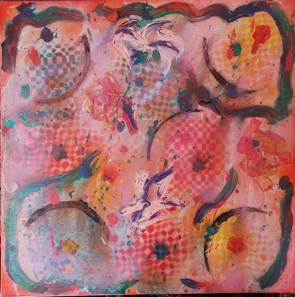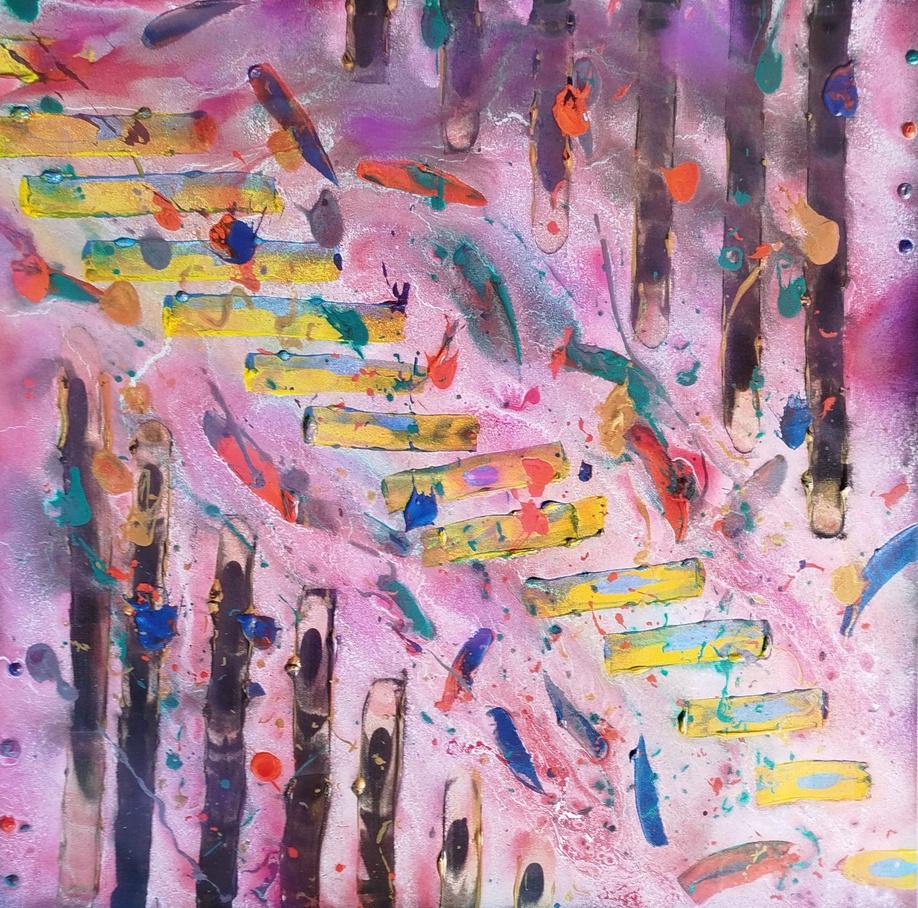 Lea Karvala's Drops of Joy is an exuberant, sun-drenched canvas that feels like a celebration. A warm golden ground is animated by splashes and drips of yellow, violet, and red that scatter across the surface like confetti or wildflowers — joyful, spontaneous, and completely alive. Karvala layers her marks with real generosity, building a surface full of incident and warmth,andtheresultisapaintingthatissimplywonderfulto spend time with. It asks nothing of you except to enjoy it, and onthatcountitsucceedsmagnificently.
