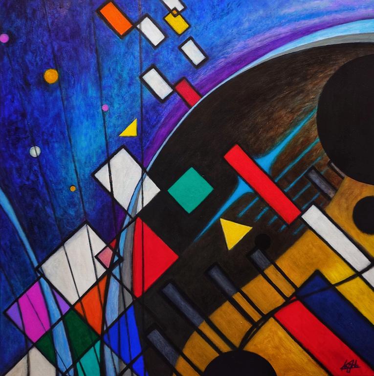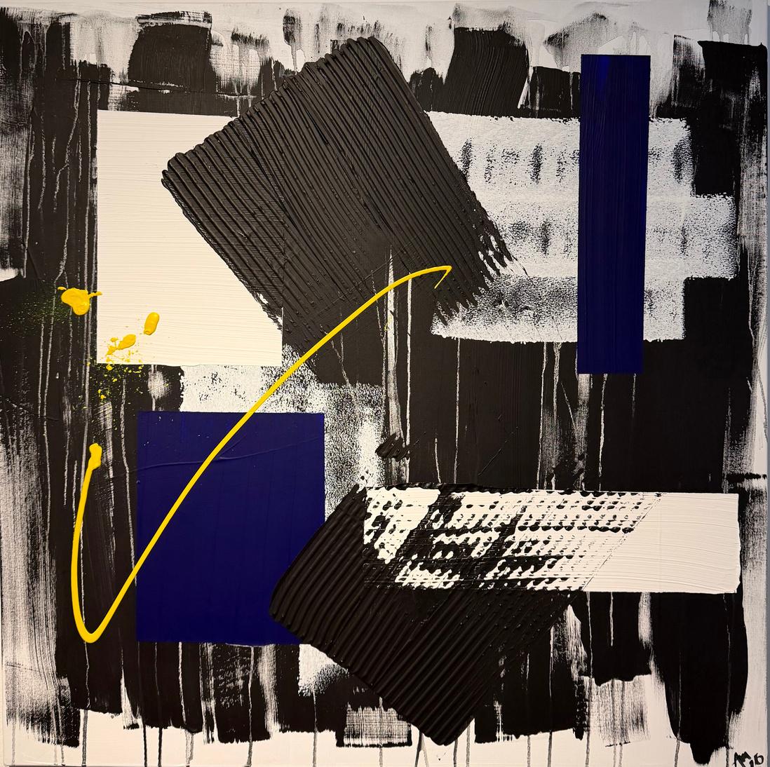 Anamarija Matic's Fragments in Motion is a painting of real authority.Againstagroundofblackandwhite—bold,gestural, physicallyapplied—twoblocksofdeepcobaltblueanchorthe composition with calm precision, while a single yellow line curves through the whole thing like a thought mid-flight. The contrast between the raw energy of the brushwork and the cool geometry of the blue passages creates a wonderful tension, and the result is a painting that feels both spontaneous and completely considered. This is abstract paintingworkingatfullpower.