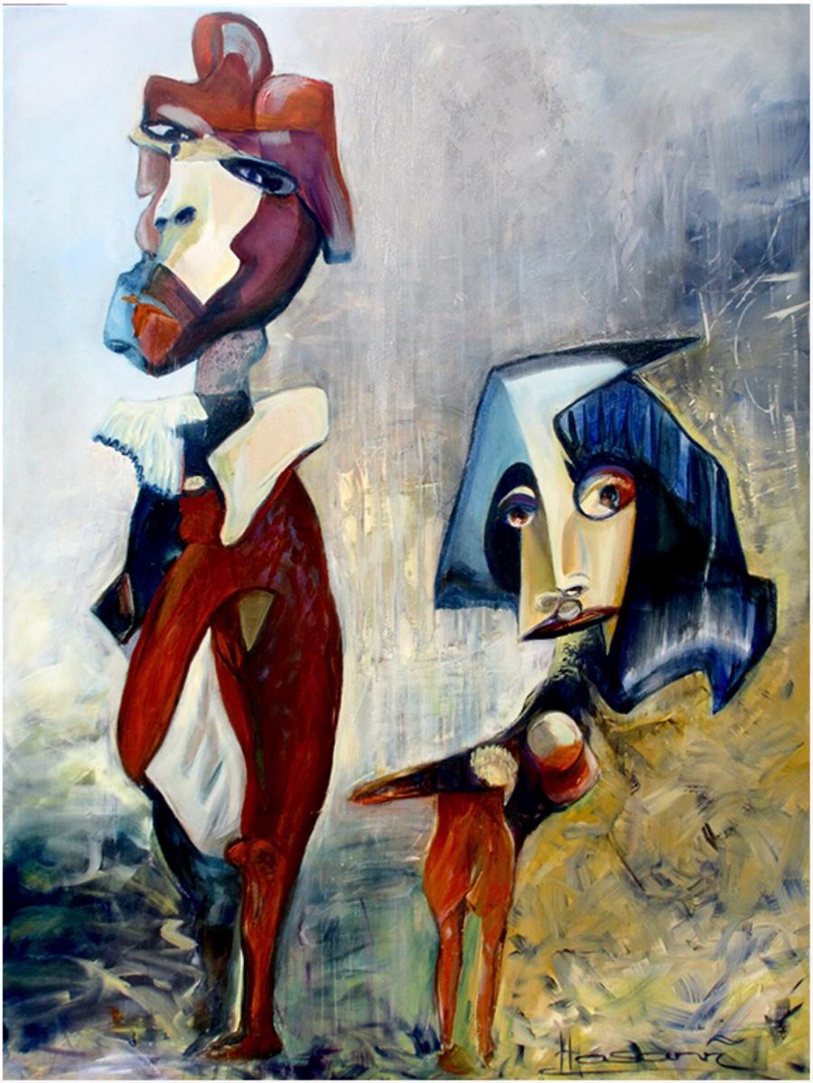 Imre Hasanic's Venetian in Alexandria is full of theatrical delight. Two elongated, angular figures — painted in the Cubist-inflected language of carnival and commedia dell'arte — occupy a hazy, atmospheric ground of grey and gold, their geometric faces and costumed bodies suggesting a story that is never quite told. The taller figure stands with a slightly imperious air; the smaller one watches, curious and a little wary. Hasanic paints with great wit and a loose, confident hand,andtheresultisapaintingthatisasentertainingasitis intelligent — one that makes you want to know what happens next.