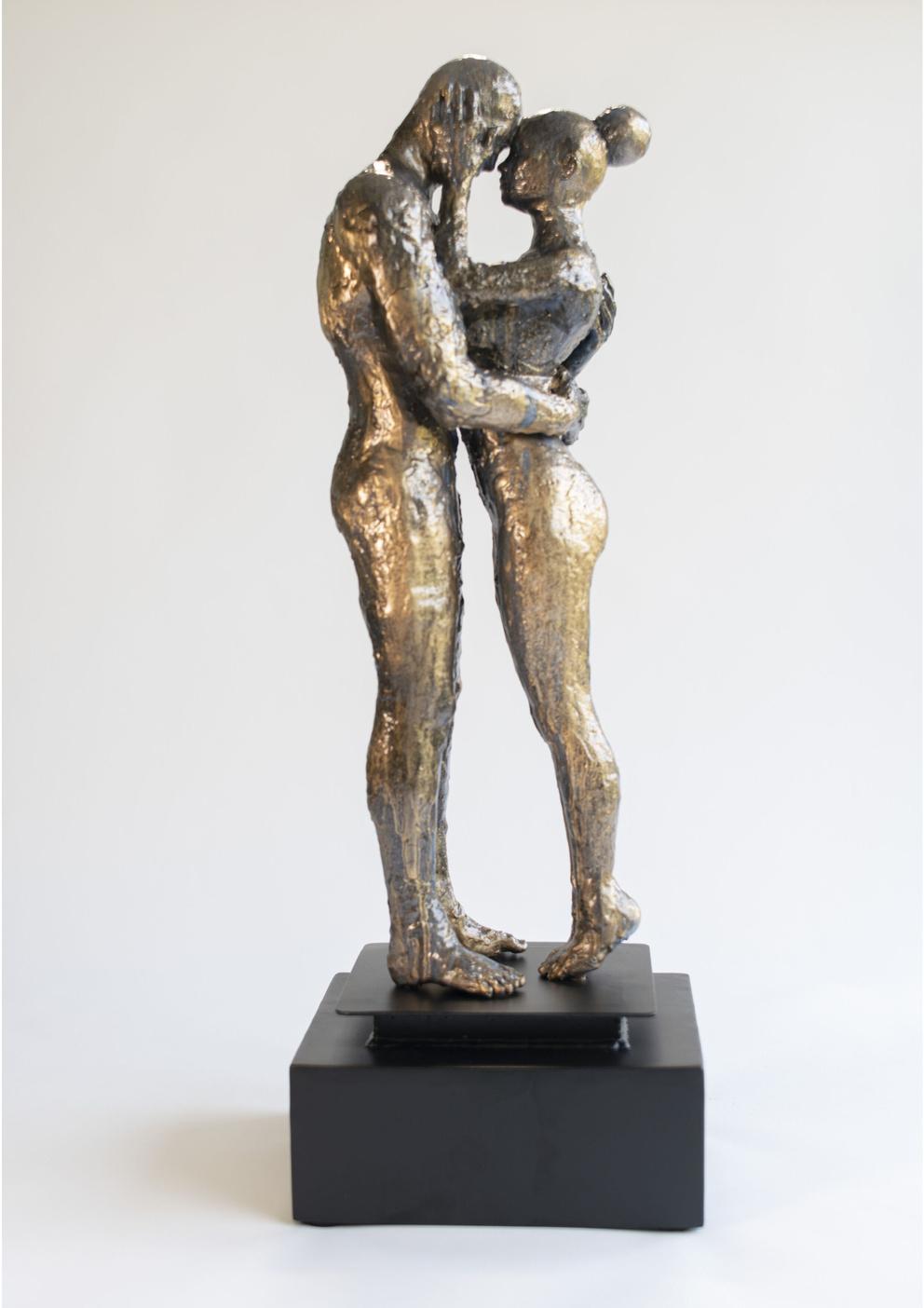 Cristóbal Corbeaux's sculpture is a study in the tenderness of two people finding each other. Two figures, slender, textured, their surfaces alive with the marks of making, stand pressed together in an embrace, the taller leaning in toward the smaller,bothofthemcompletelyabsorbedinthemoment.The bronze-like finish gives the work a warmth and weight that suitsitssubjectperfectly,andthesimplicityofthecomposition —noprops,nosetting,justtwobodiesandthespacebetween them closing makes it quietly devastating. This is a sculpture aboutlove,renderedwithgreatskillandgreatfeeling.